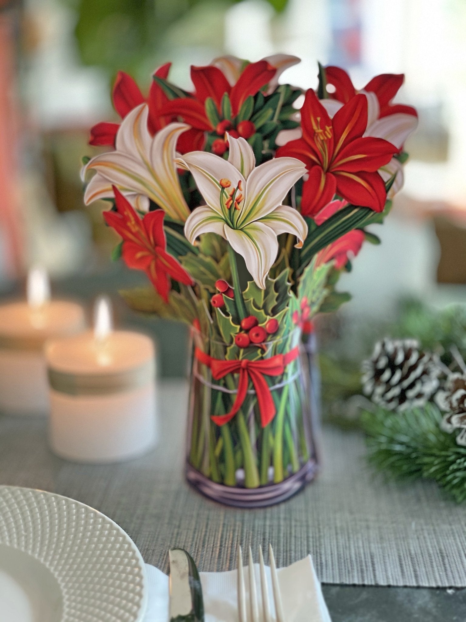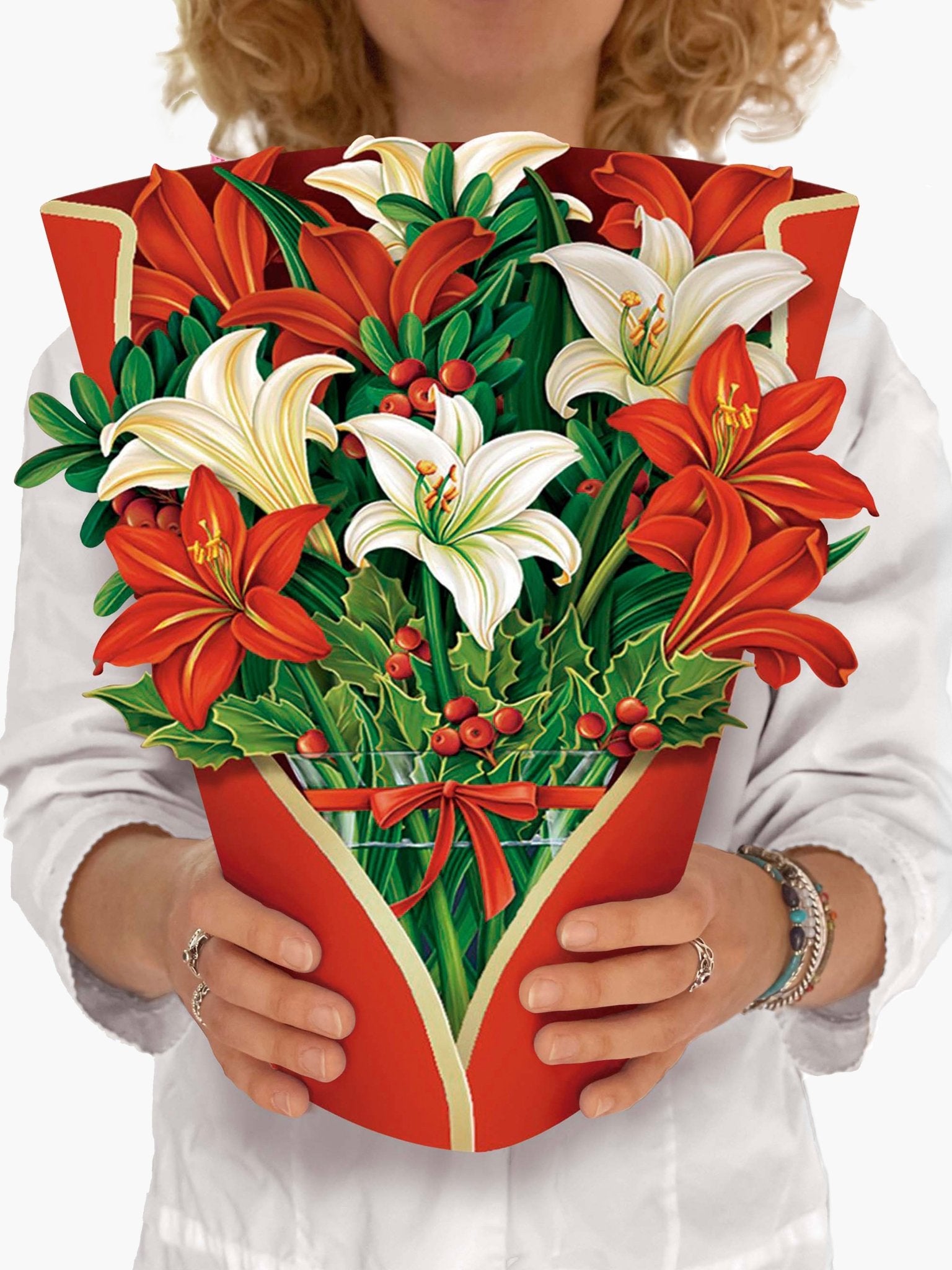 - Includes: bouquet, matching bouquet note card, paper vase and festive mailing envelope