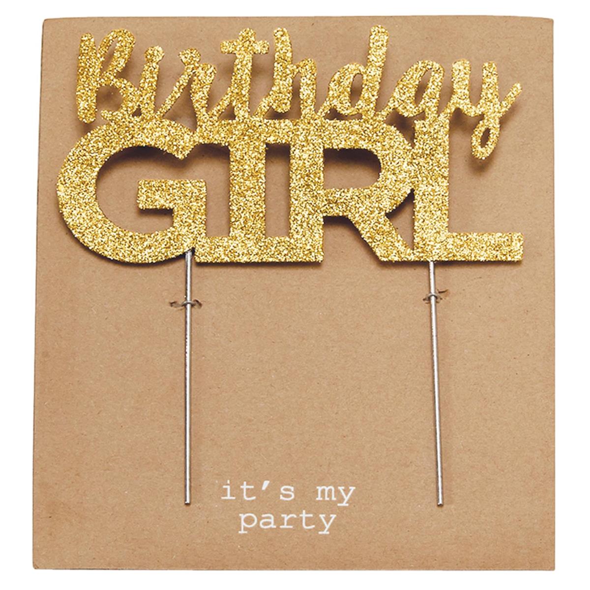 Keepsake "Birthday GIRL" cake topper features 4 candle holder spaces and stainless steel stakes for cake display and stability.