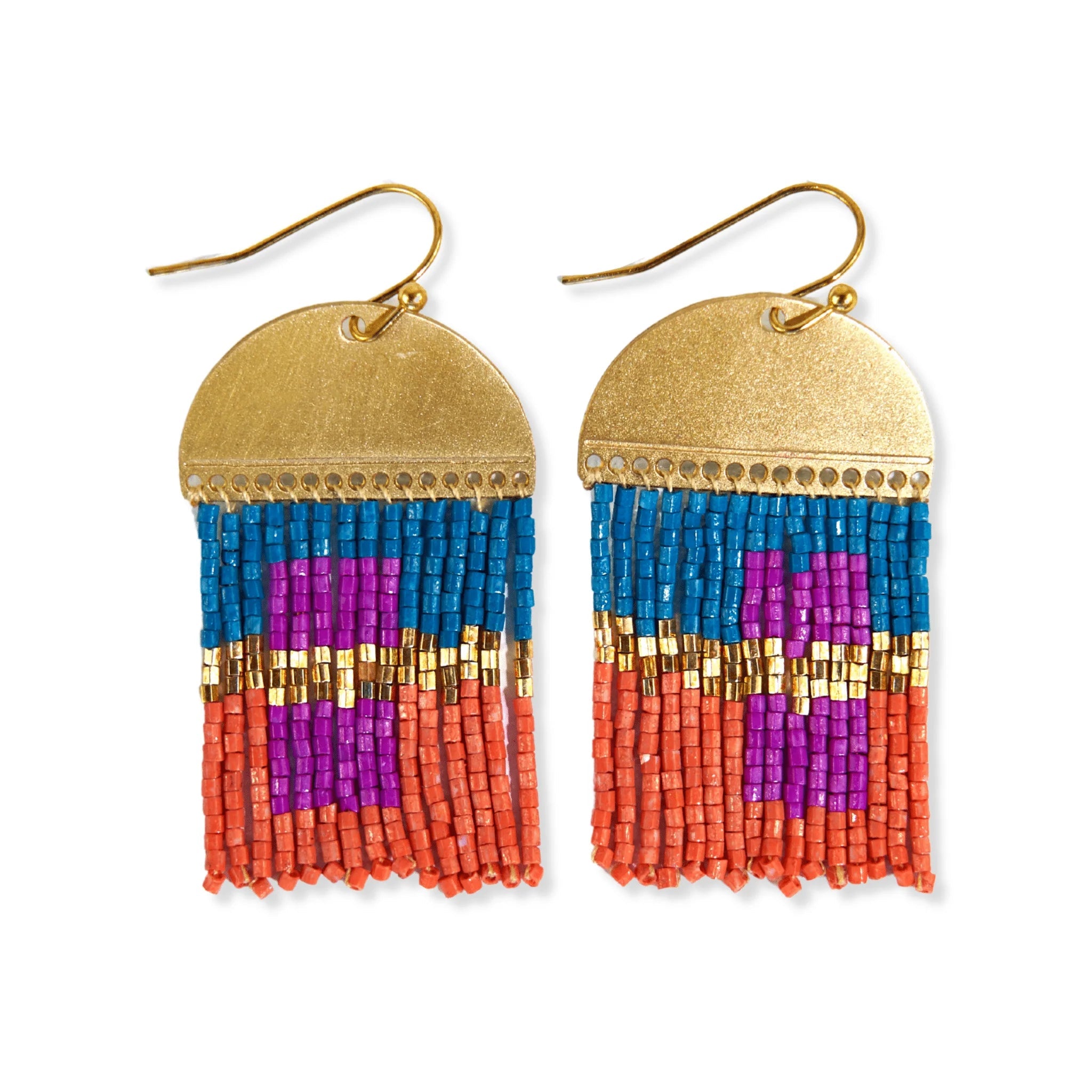 This geometric fringe design features colored glass beads hanging from a modern half-circle brass piece to bring balance and structure to your jewelry box.