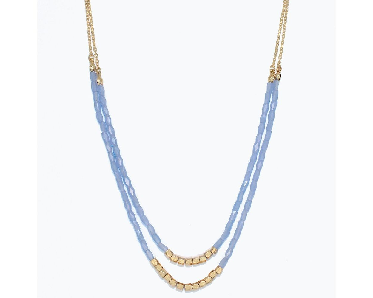 Two rows of faceted gold and periwinkle beads.