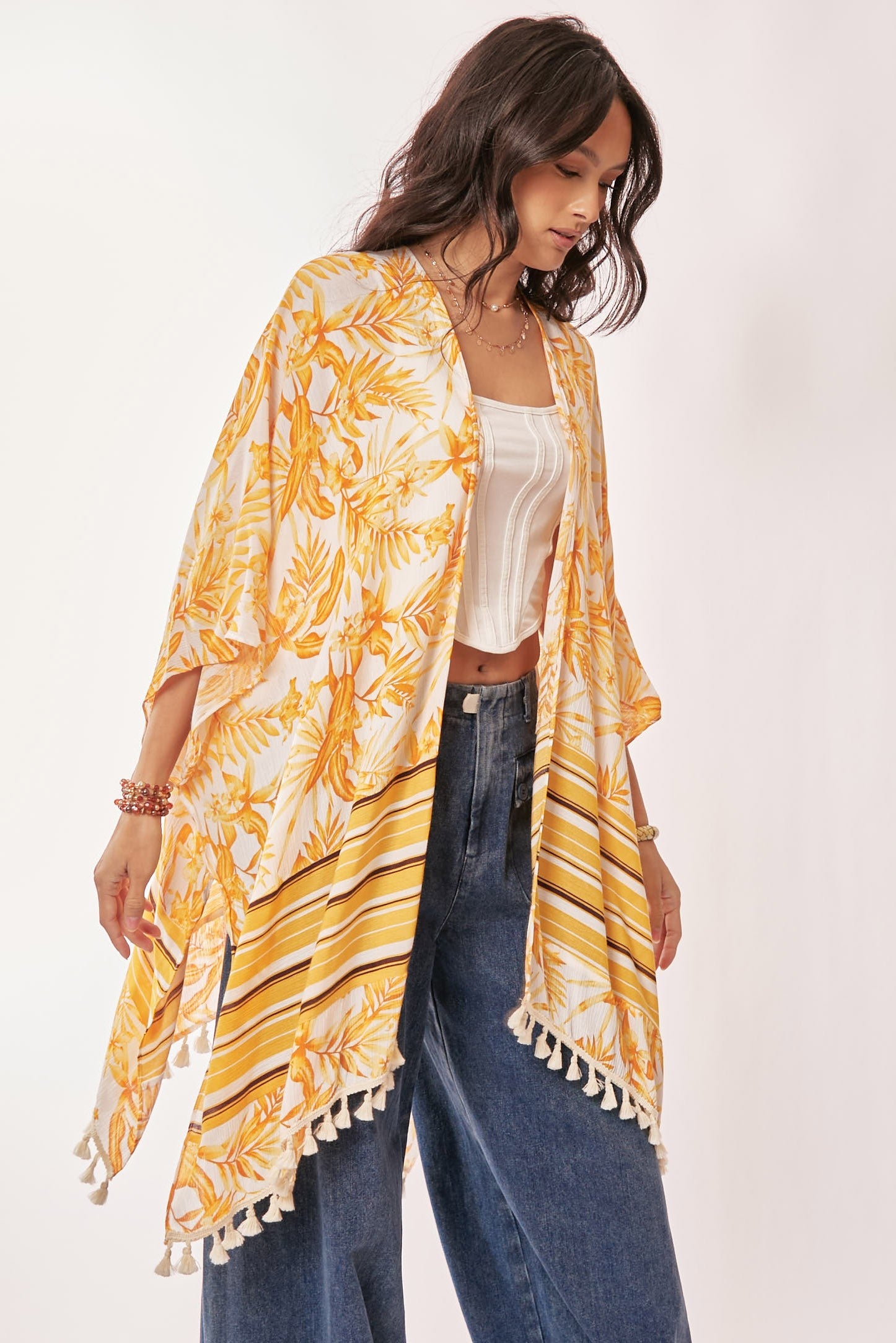 LEAF PATTERN PRINTED POMPOM TASSEL DETAIL KIMONO COVER UP