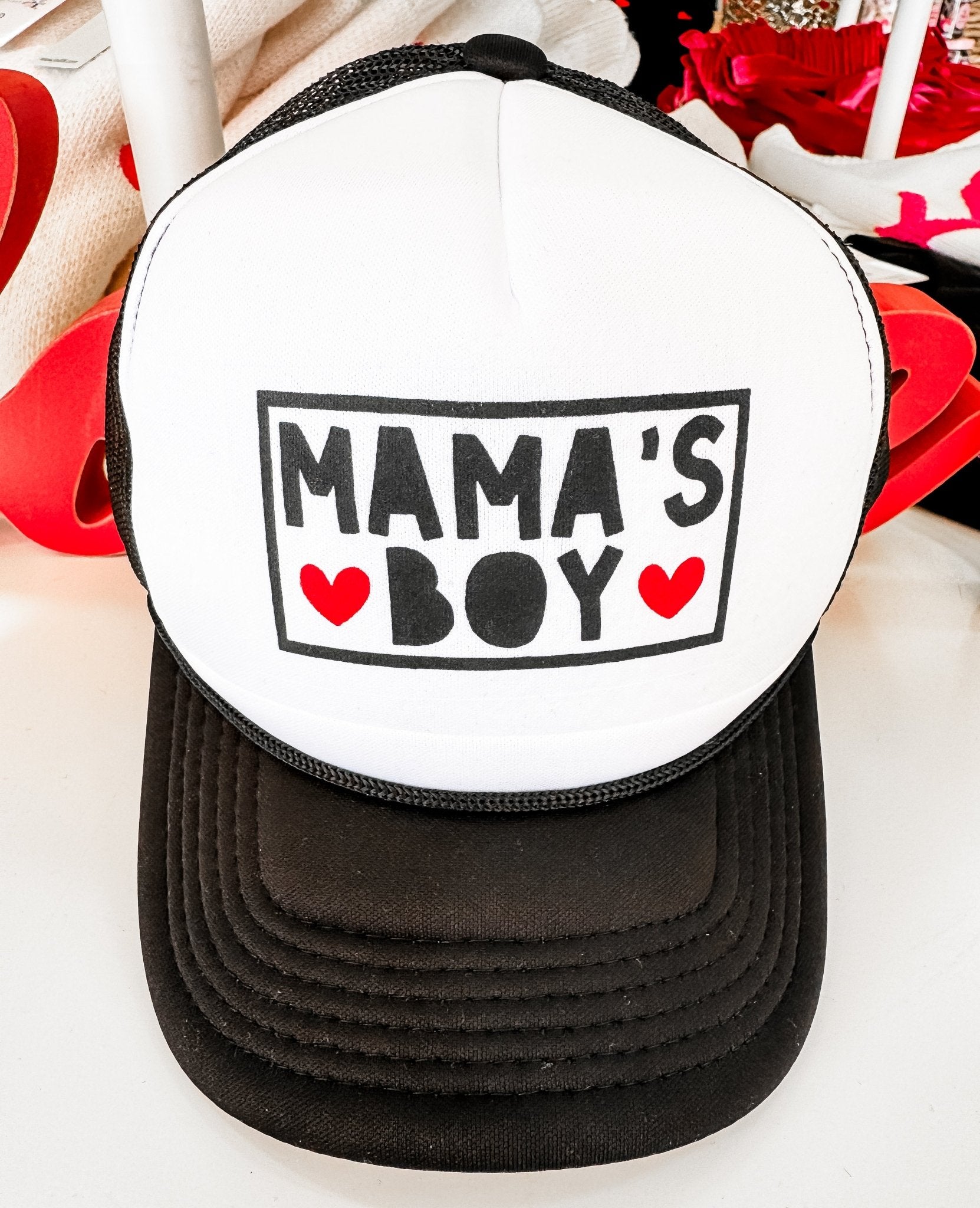 These Mama's Boy Trucker Hats for kids are a fun and festive accessory for celebrating Valentine's Day or any other day of the year!