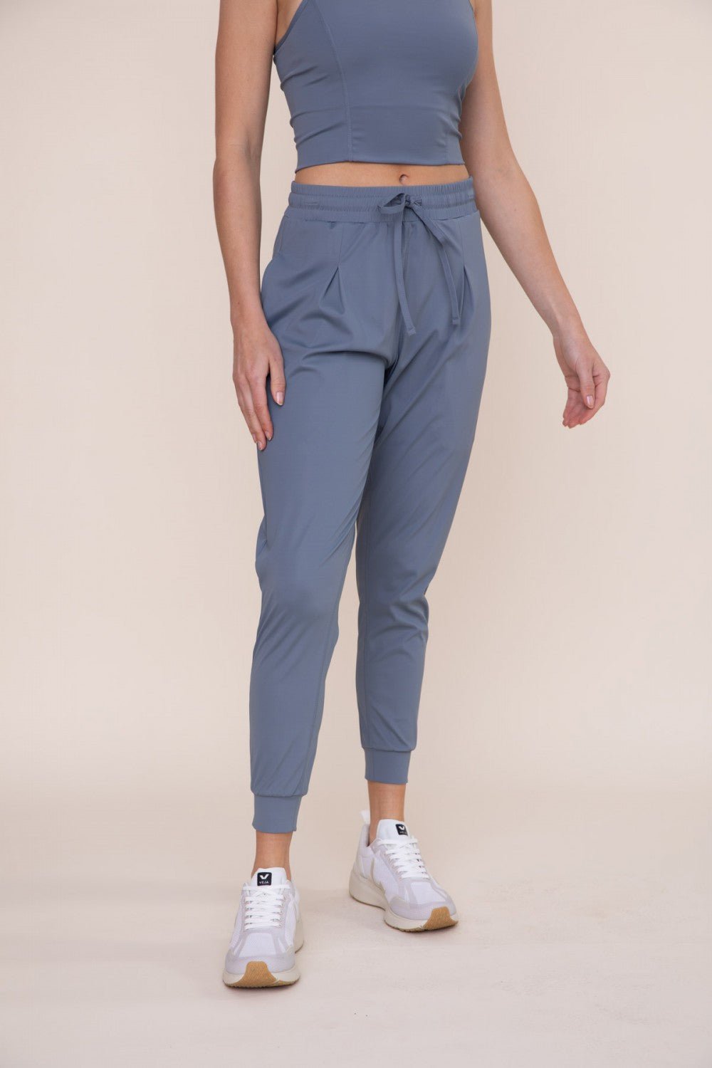 These silky jogger pants feature an adjustable drawstring waistband, inseam pockets, front pleats, and cuffed hems. Wear them while working from home or running errands.