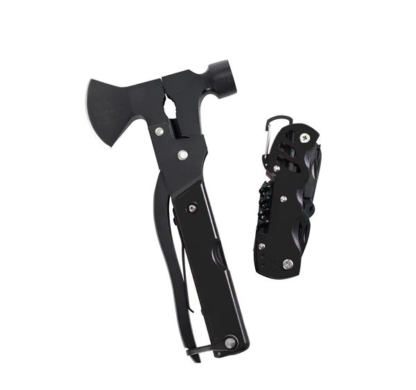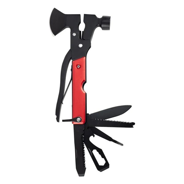 INCLUDES: Axe • Hammer • 2 sets of pliers • Saw • Wire Cutter • Knife • File • Hex wrench • Fish scaler • Bottle opener • Philips screwdriver • 2 slotted screwdrivers • Sheath • AND MORE!