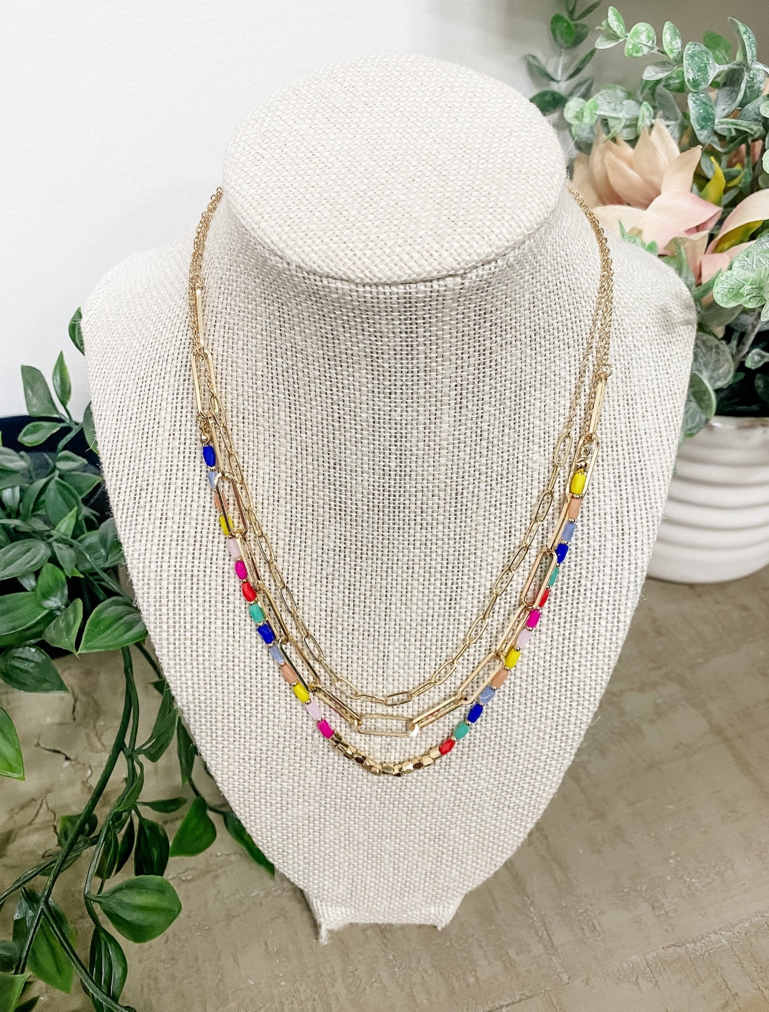 This triple chain necklace is the perfect for any outfit! Featuring gold chain link & multi color beads is sure to stand out from the crowd! Throw it on over your favorite blouse and skirt, or pair it with a sweater and jeans for a gorgeous look!