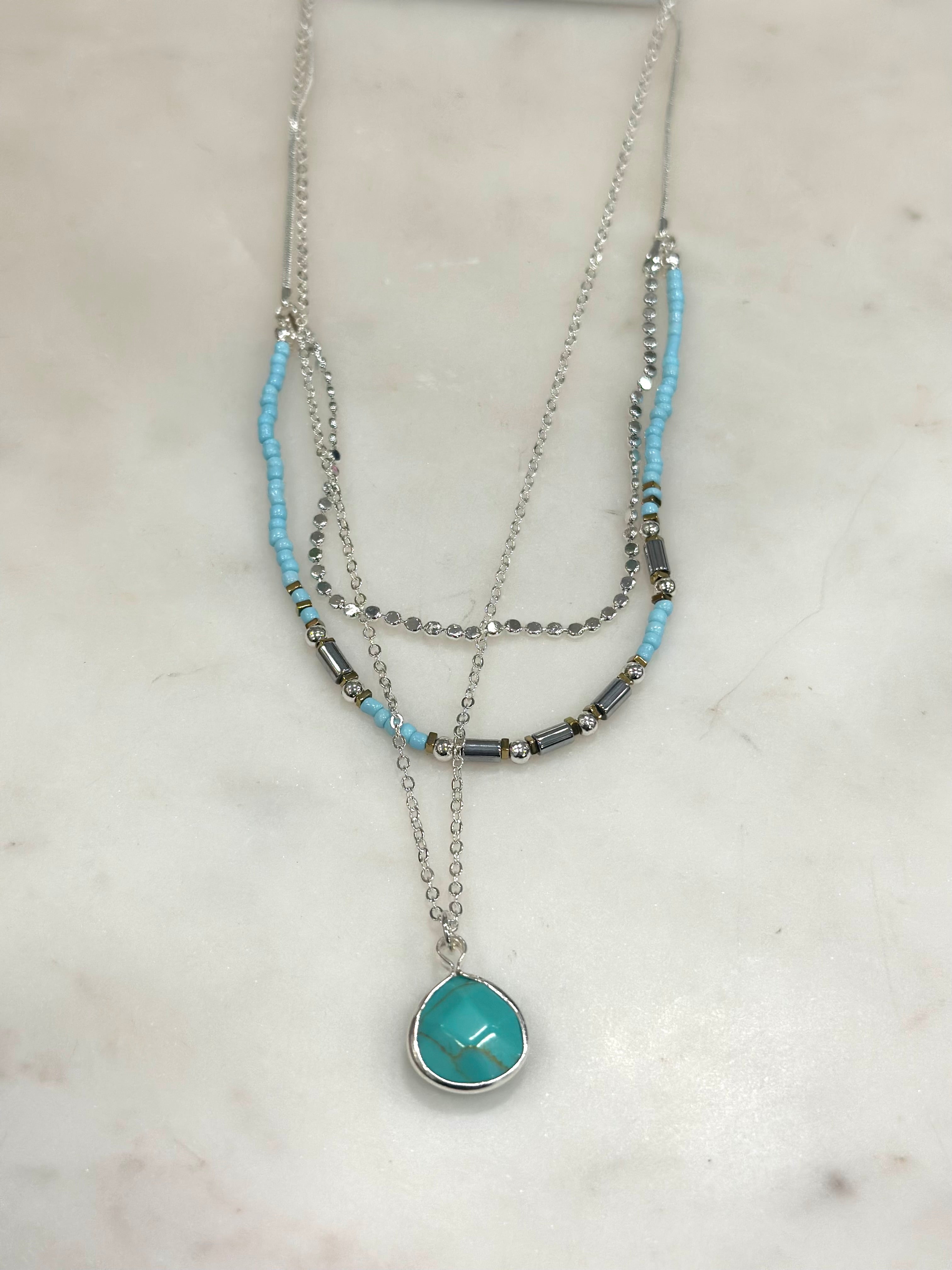 Effortless layers come together in this beautifully styled necklace featuring cool blue beads, polished silver-tone chains, and a striking turquoise-inspired pendant. Designed to give you a perfectly stacked look in one easy piece, this necklace adds texture, color, and coastal charm to any outfit.