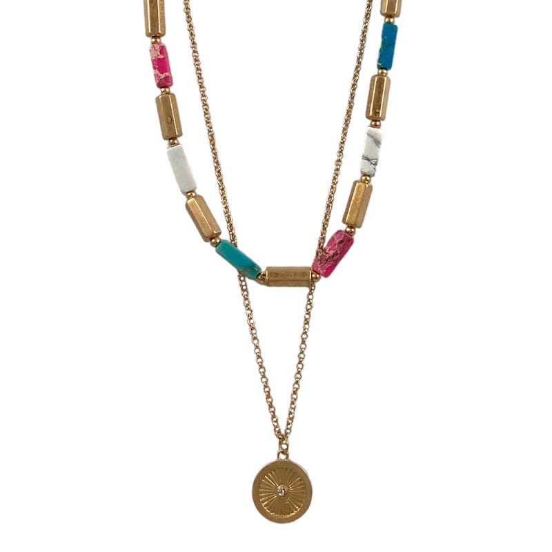 This necklace is the perfect for any outfit! Featuring layer necklace with stone & coin accent is sure to stand out from the crowd! Throw it on over your favorite blouse and skirt, or pair it with a sweater and jeans for a gorgeous look!