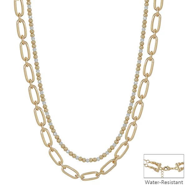 White Crystal Beaded Layered with Gold Oval Link Necklace - Water Resistant - 16"-18"
