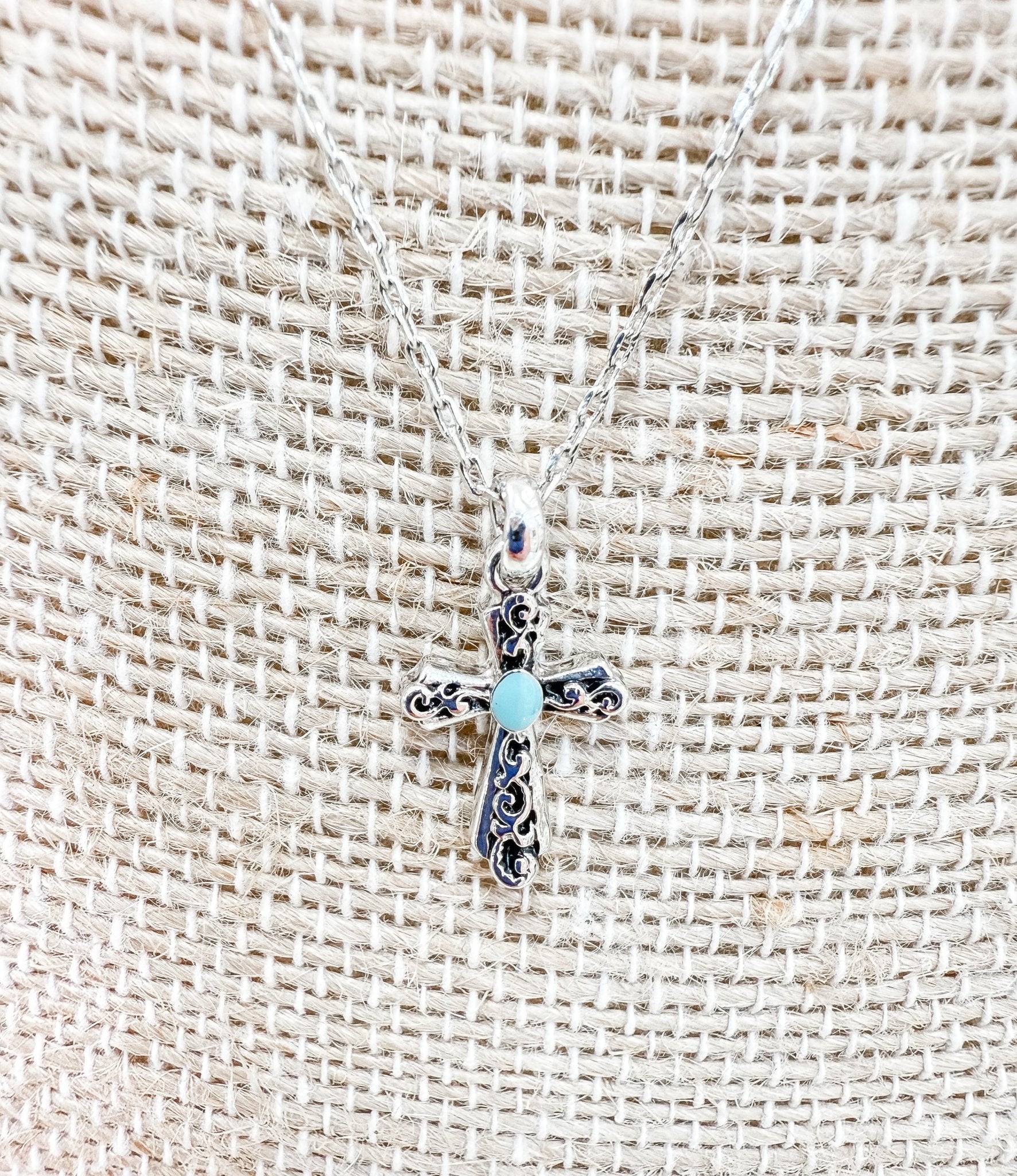 Add some divine style to your look with our Soul Radiance Cross Necklace. This unique necklace features a radiant textured cross design and a small aqua stone that will surely bring a touch of spiritual energy to any outfit. Perfect for casual or formal wear. Let your soul shine and this gorgeous sterling silver necklace!