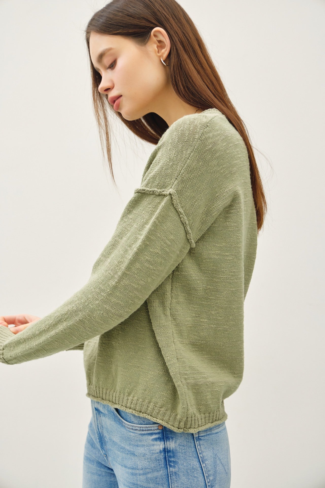 EXPOSED SEAM DETAIL * RAW SEAM DETAILS * DROP SHOULDER * CROPPED TO THE NATURAL WAIST * RELAXED FIT * ROUND NECK * LONG SLEEVE * RIBBED CUFF * CHUNKY RIBBING AT THE HEM * KNIT SWEATER * PULLOVER STYLE * COTTON