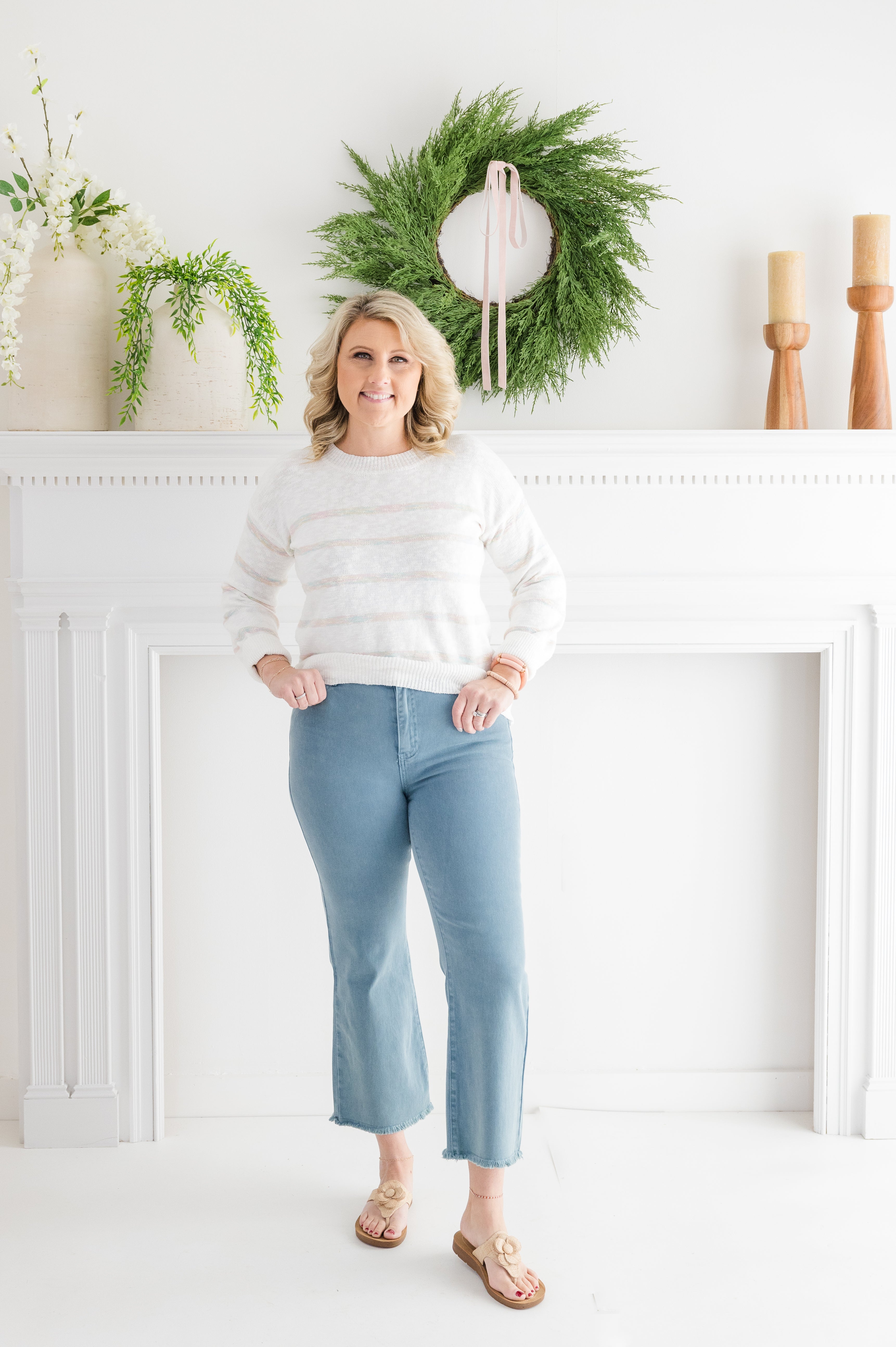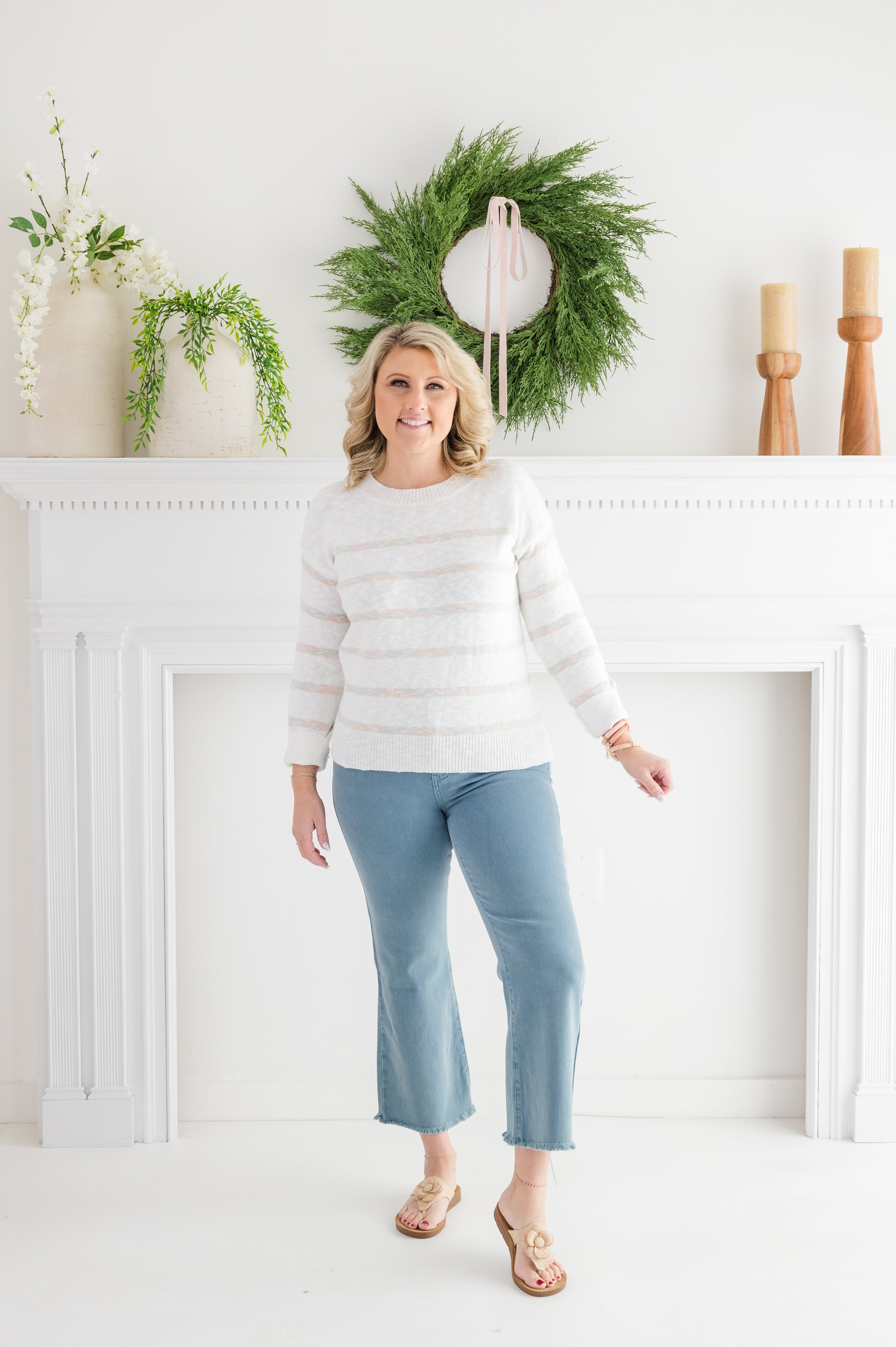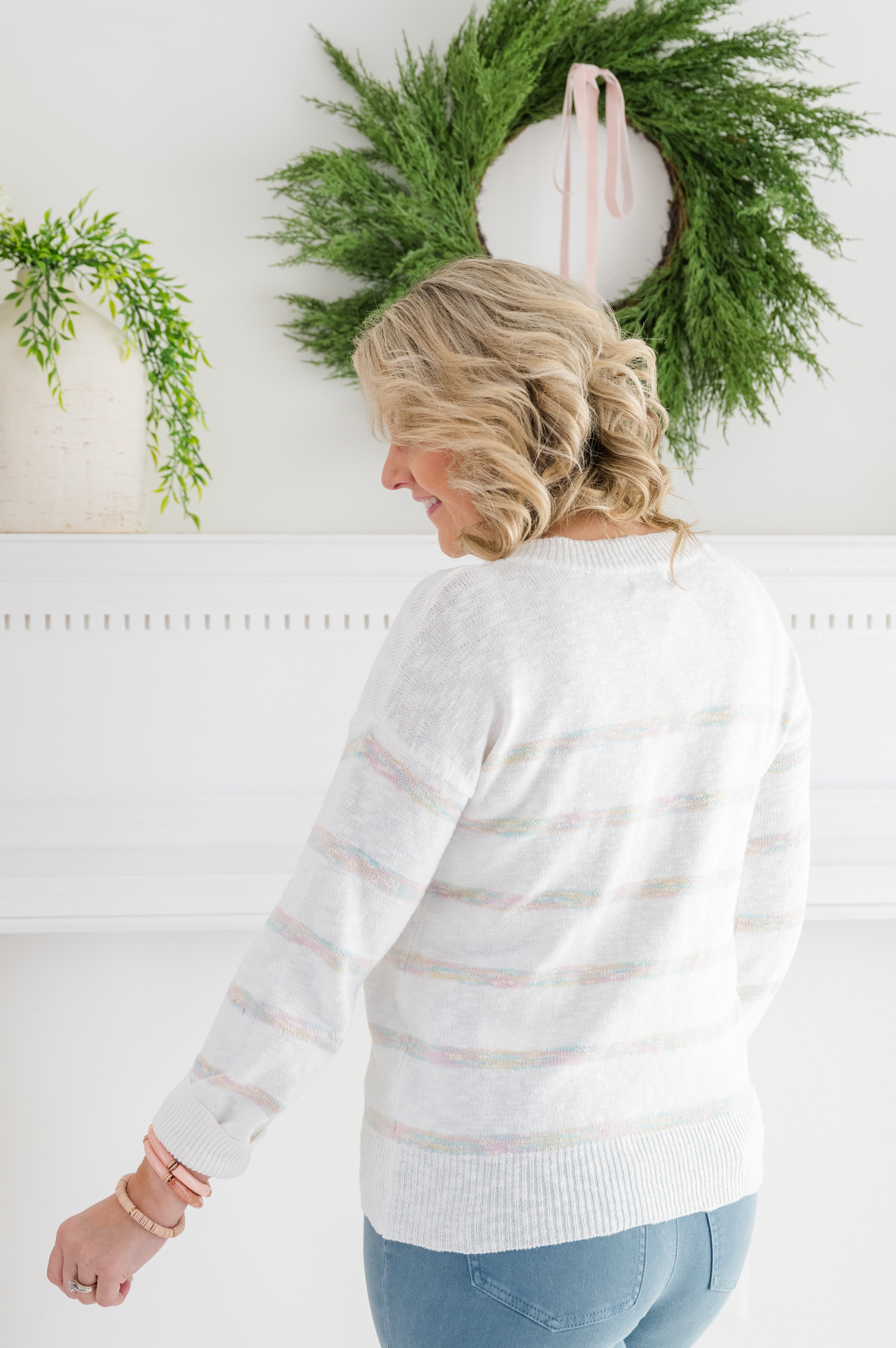 Wrap yourself in effortless elegance with the Sweet Kissed Pastel Stripe Sweater. This lightweight ivory knit features subtle pastel stripe detailing for a delicate pop of color that feels fresh and feminine. Designed with a relaxed fit and classic crew neckline, it’s perfect for layering or wearing solo for an easy, polished look. Pair it with your favorite denim for everyday wear or dress it up with trousers for a cozy-chic outfit you’ll reach for all season long.