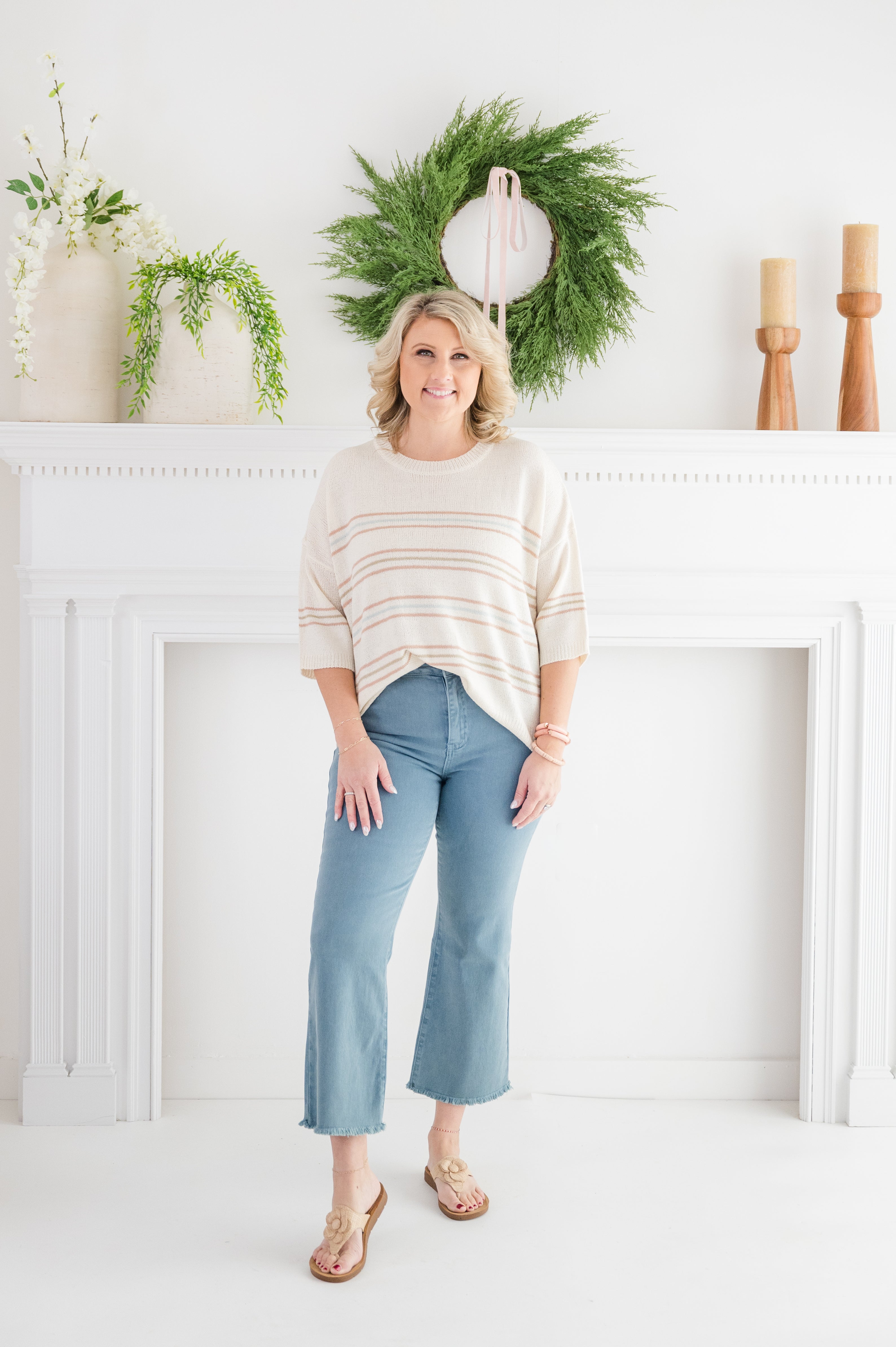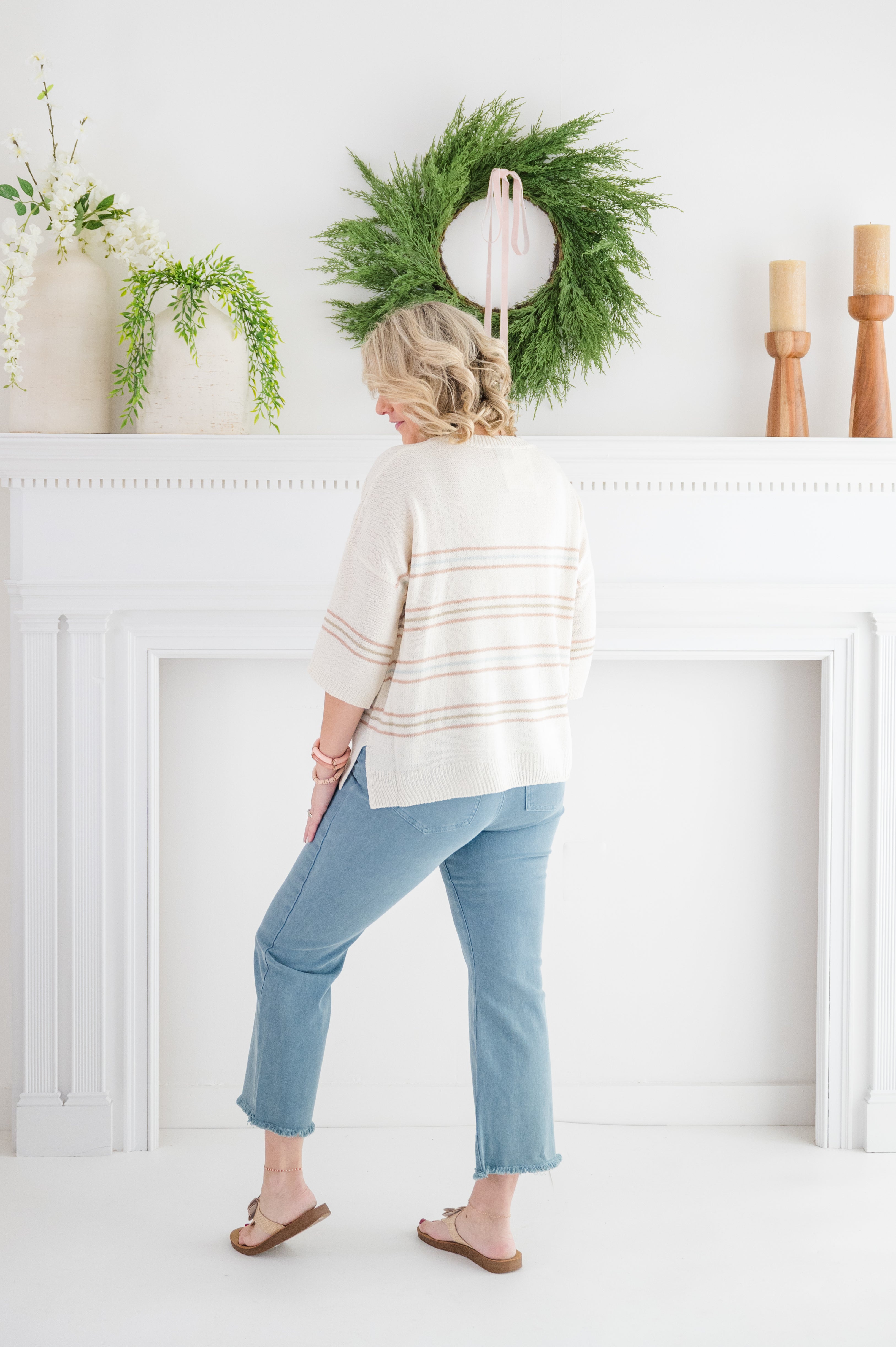 Meet your new go-to for effortless everyday style. The Graceful Calm Stripe Sweater features a dreamy blend of soft ivory with warm camel, sage, and subtle blue stripes for that relaxed, breezy-inspired vibe. Crafted from a lightweight, breathable knit, it drapes beautifully with a slouchy fit and easy dolman sleeves — perfect for layering now and wearing solo into spring.