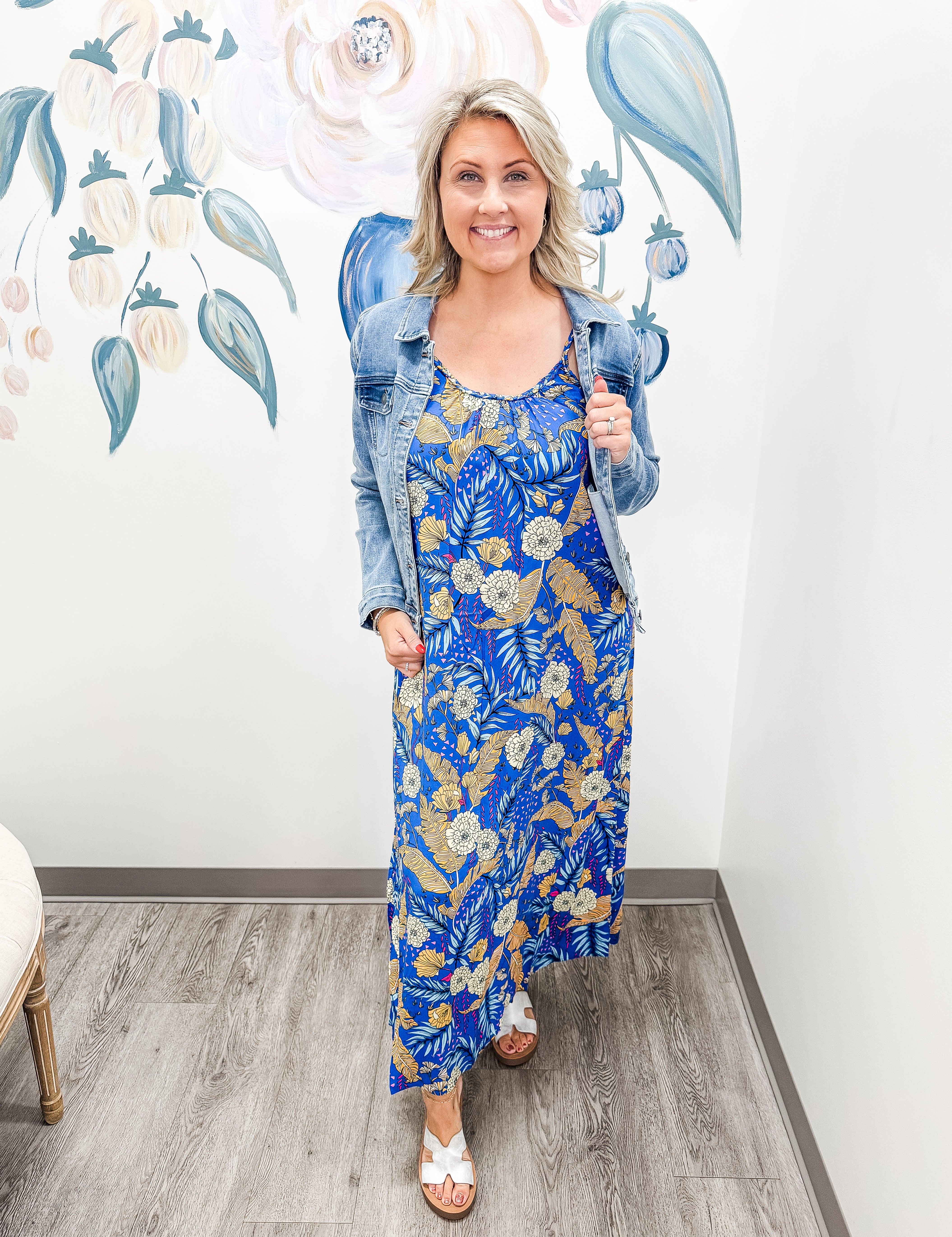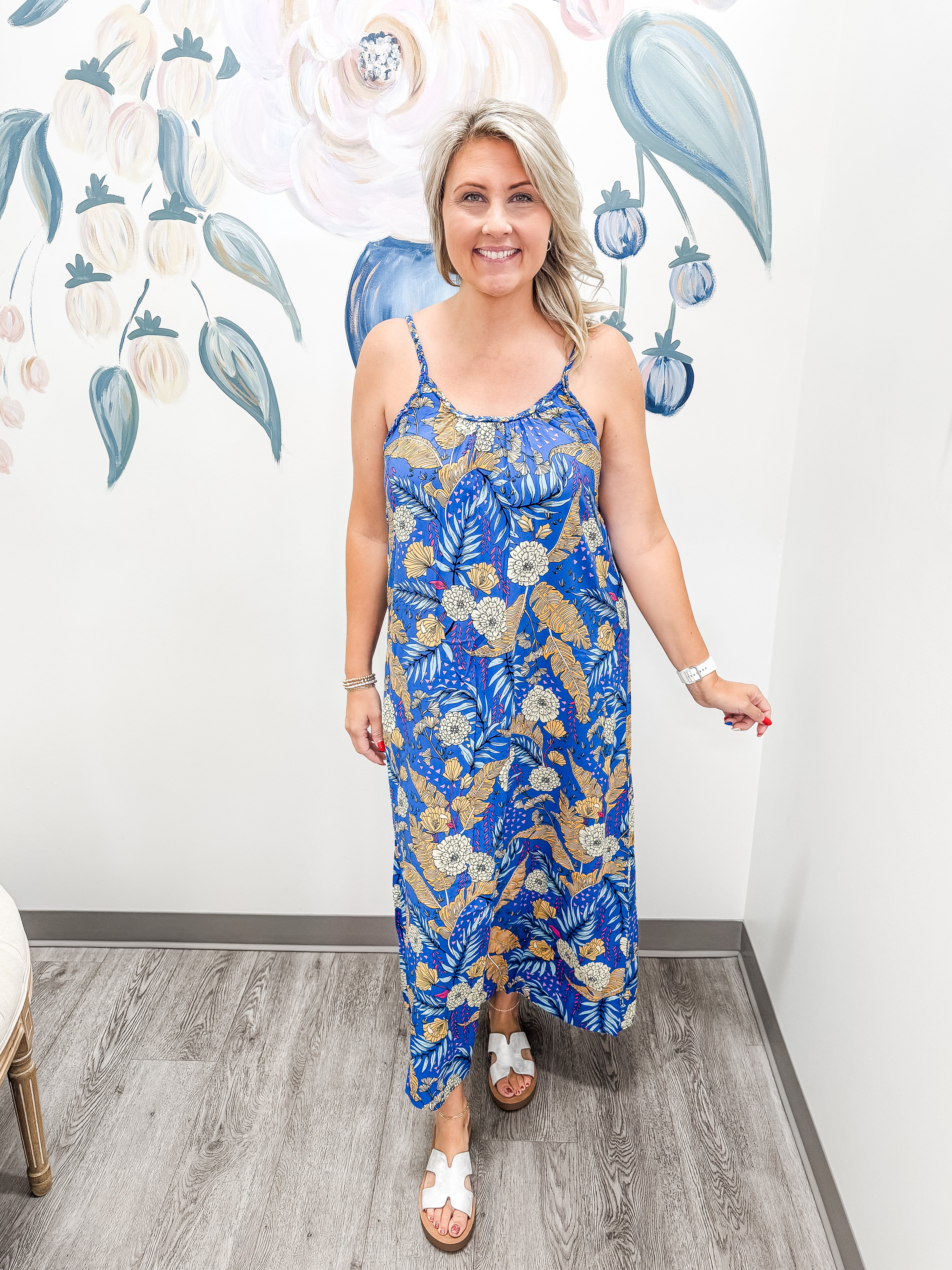 Embrace the sunshine in this free-flowing maxi dress, defined by a bold statement print and an elegant scoop neckline. The braided straps are conveniently adjustable for a just-right fit.