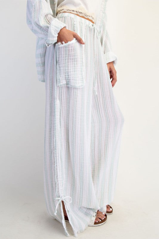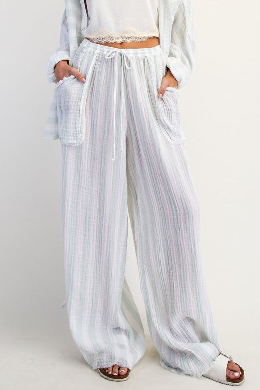 These, Island In The Sun Wide Leg Pants are a soft, textured cotton gauze fabric. Designed in a slouchy, wide-leg silhouette with an elasticated tie-front waistline, oversized patch pockets and cinched-sides with split hems for added movement.