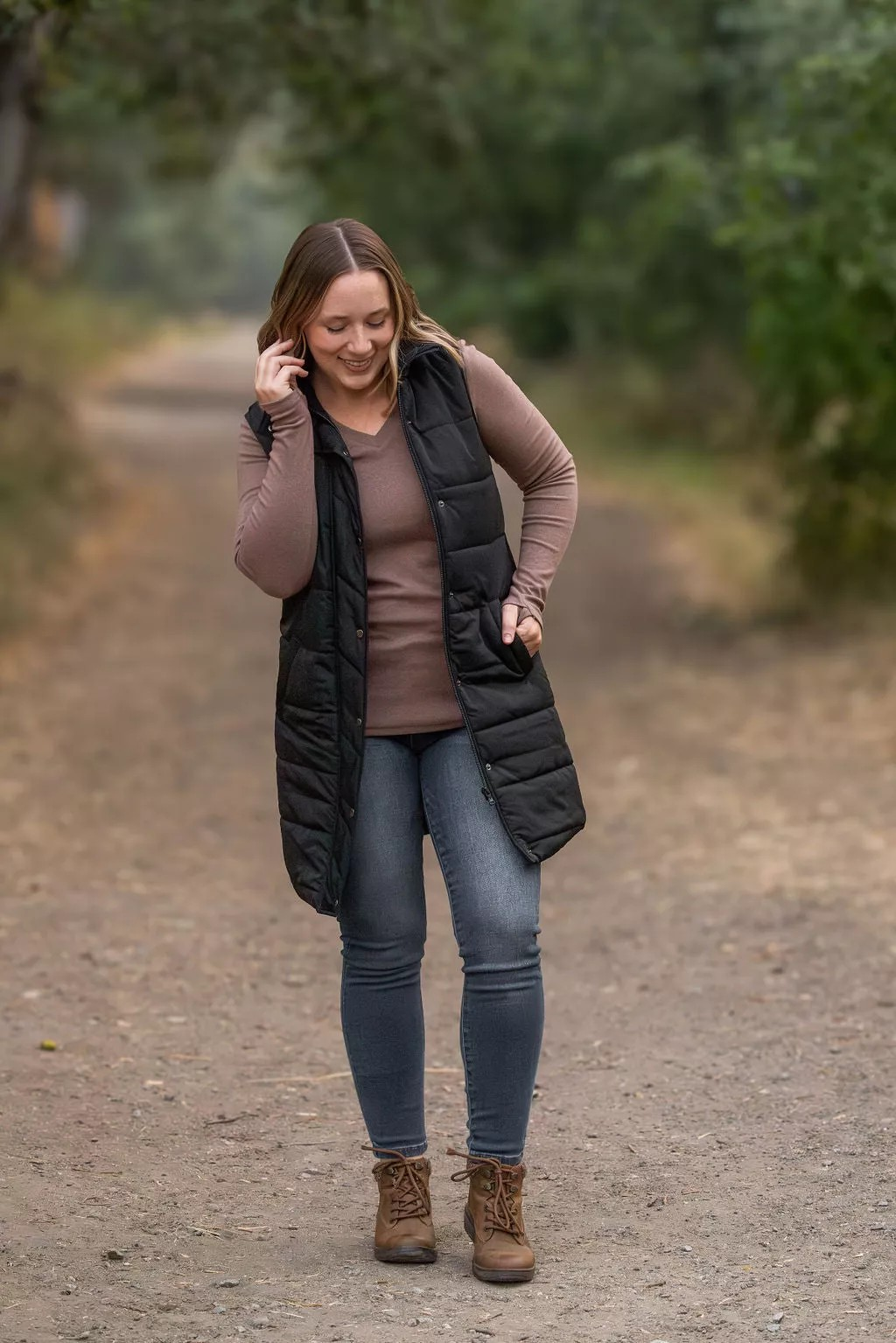 Introducing the Harlow Long Vest available in many colors. With its convenient pockets, zipper and button closure and this versatile vest has so many pairing options., This vest is a must-have for any wardrobe. Get ready to fall in love and complete your fall and winter looks!