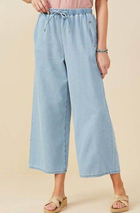 Get comfy and stylish with our Style Nook Denim Pants. Featuring a wide leg design and an elastic waist with drawstring front, these lightweight pants are perfect for all-day wear. Say goodbye to discomfort and hello to style!