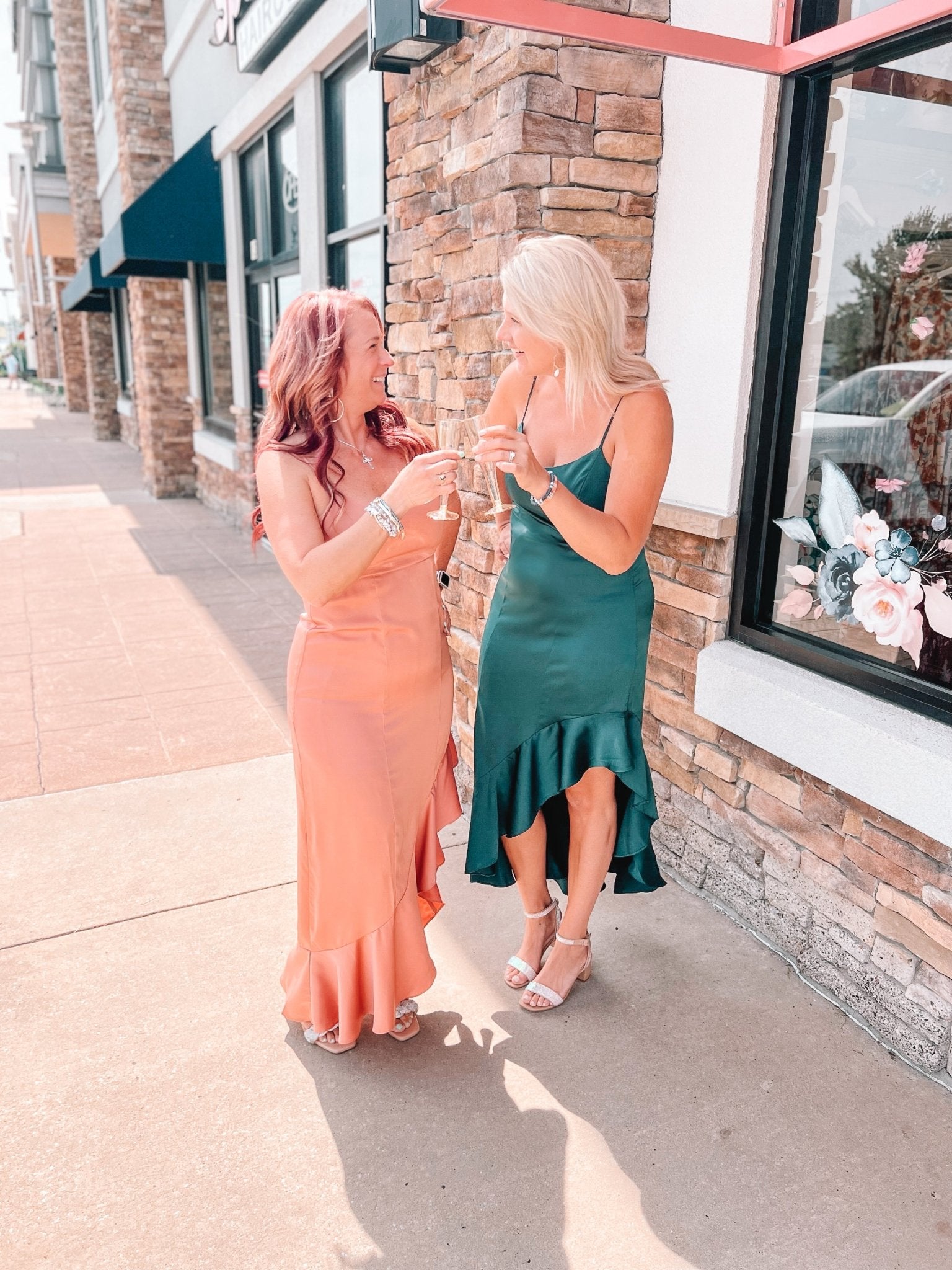 Satin, ruffle bottom, diagonal hem dress. Features sweetheart neckline and adjustable spaghetti straps and back half zipper.