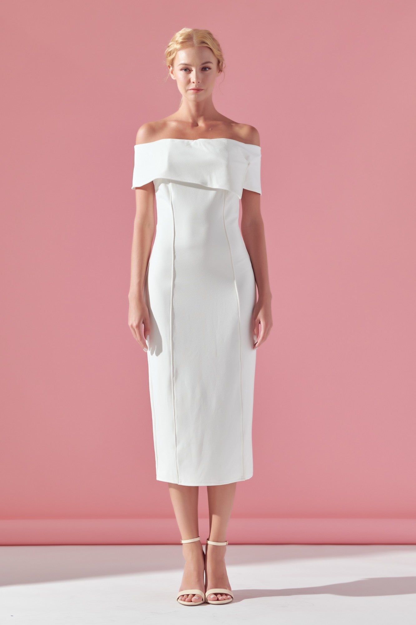 This white, midi dress features a strapless neckline and a twisted off the shoulder look.