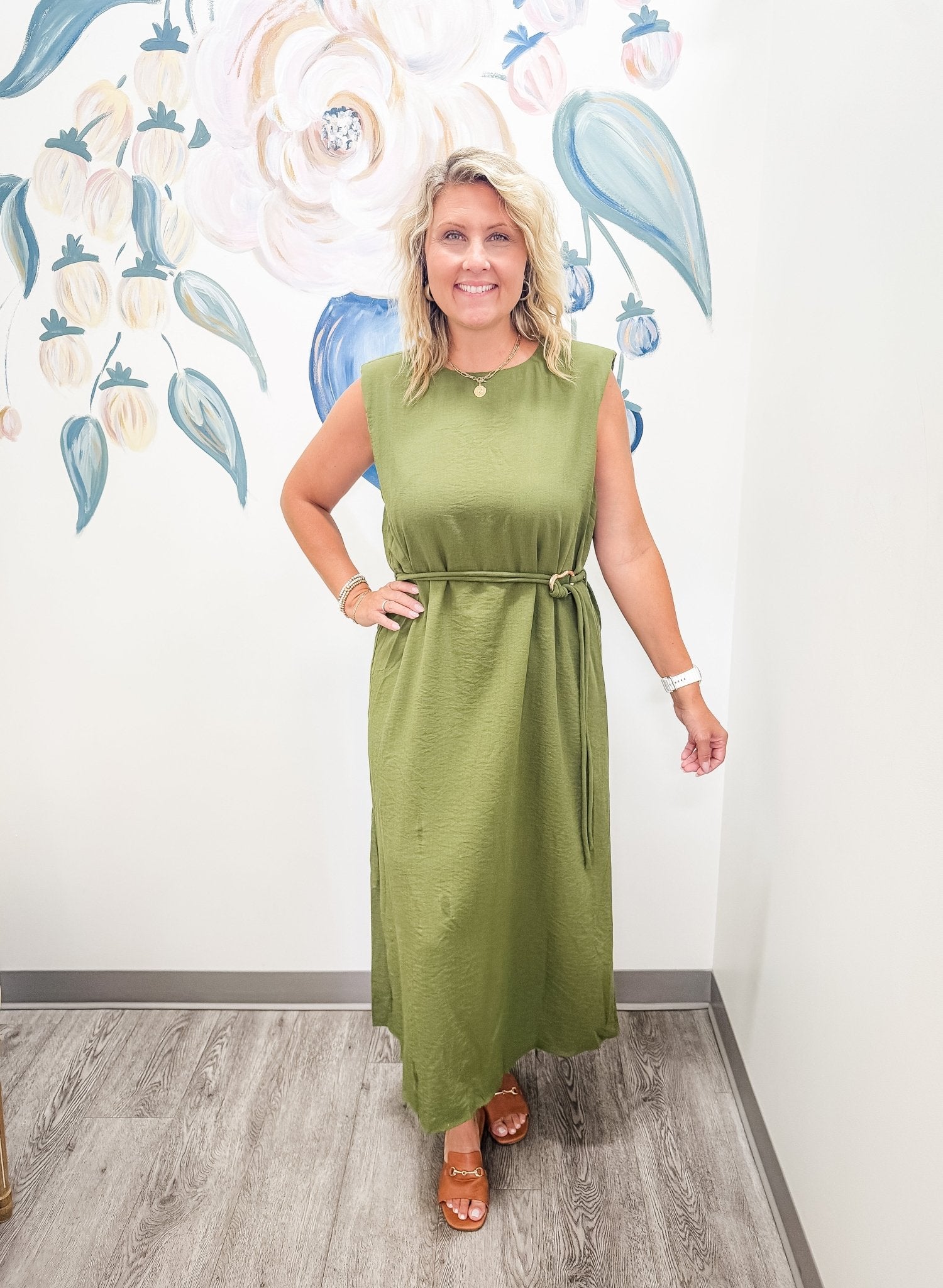 Solid muscle shoulder slit hem midi dress featuring embellished gold accent fastener belt. Single button keyhole closure at back neck. Lined. Woven. Non-sheer. Lightweight.