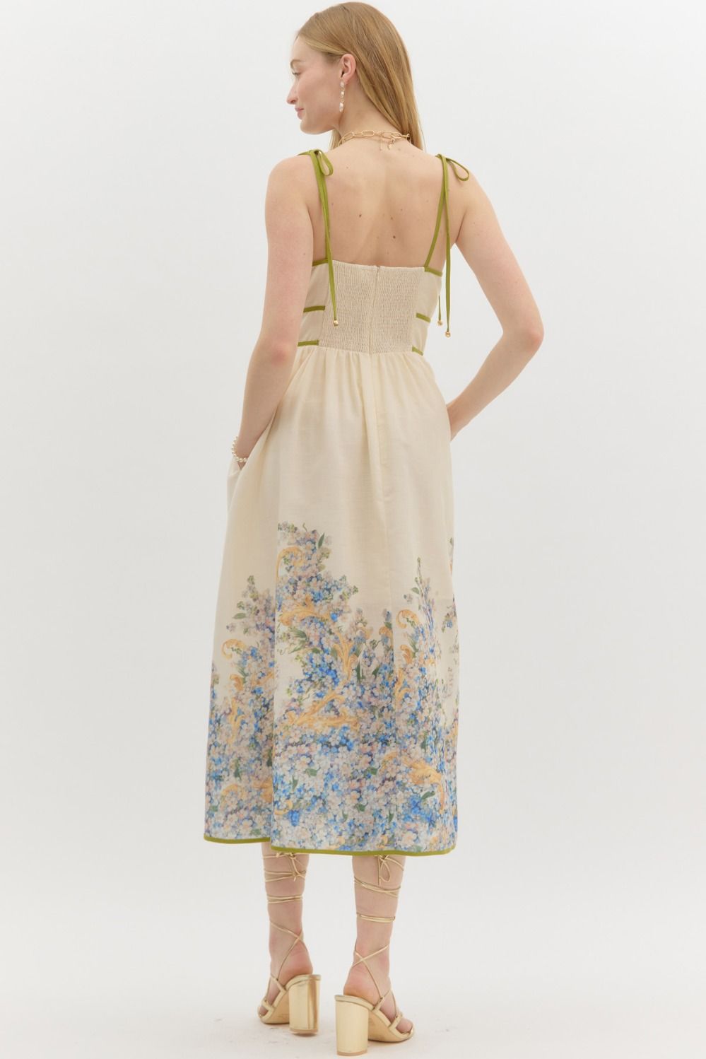 Floral print shoulder tie midi dress featuring accented border hem. Smocked zipper closure at back. Pockets at side. Lined. Woven. Non-sheer. Lightweight.
