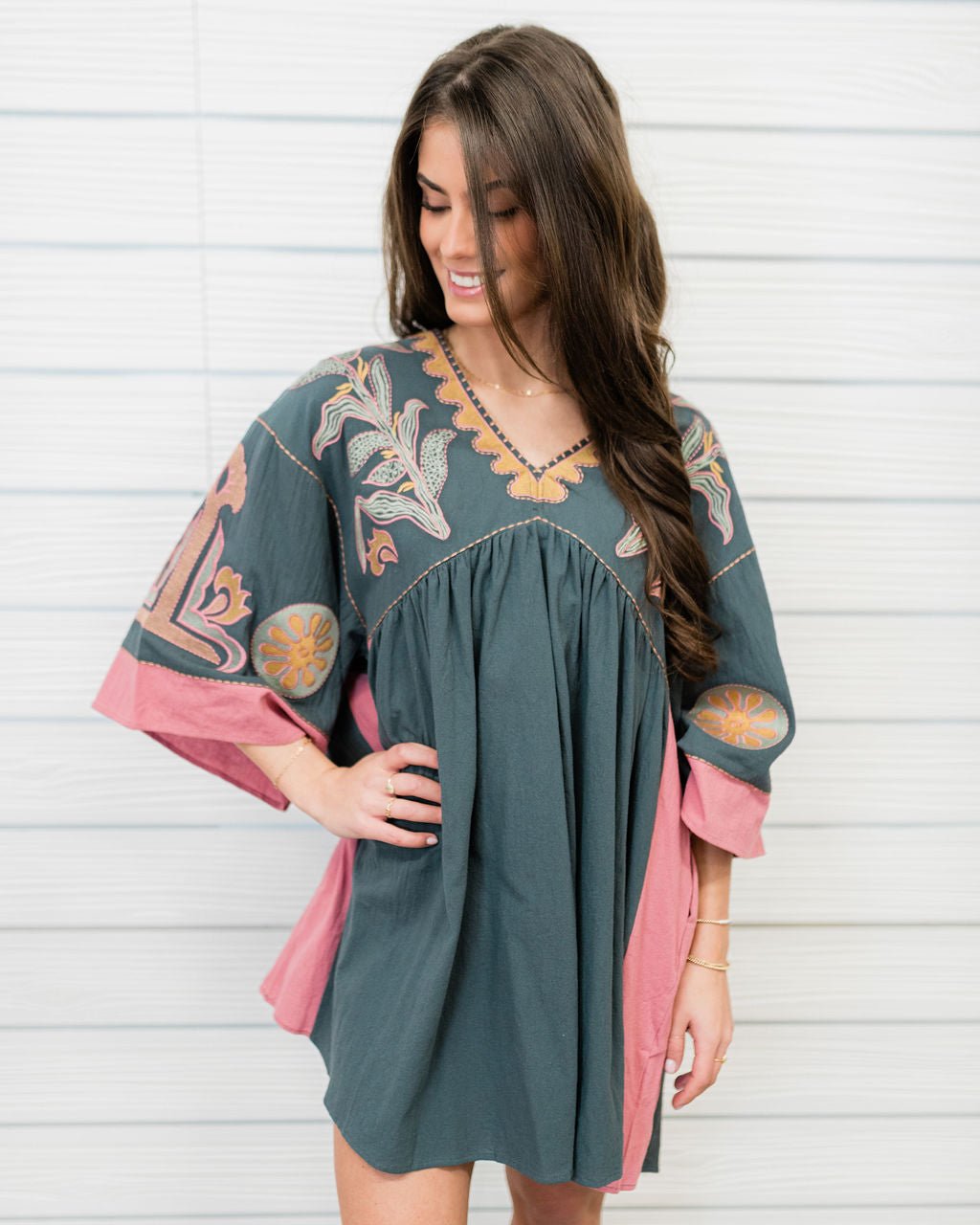 EMBROIDERED POLY LINEN WOVEN DRESS -V NECK -DROPPED SHOULDERS -3/4 SLEEVES -EMBROIDERY DETAILING -RUCHING DETAILING -POCKETS -LOOSE AND RELAXED FIT -EASY PULL OVER STYLE.