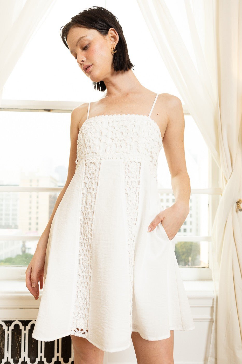 This airy sleeveless mini dress is perfect for adding elegance to your warm-weather wardrobe. Featuring delicate eyelet detailing, adjustable spaghetti straps, and a relaxed A-line silhouette, this dress provides a beautiful blend of comfort and style. Whether you're heading to brunch, a casual outing, or a summer party, this piece exudes effortless charm.