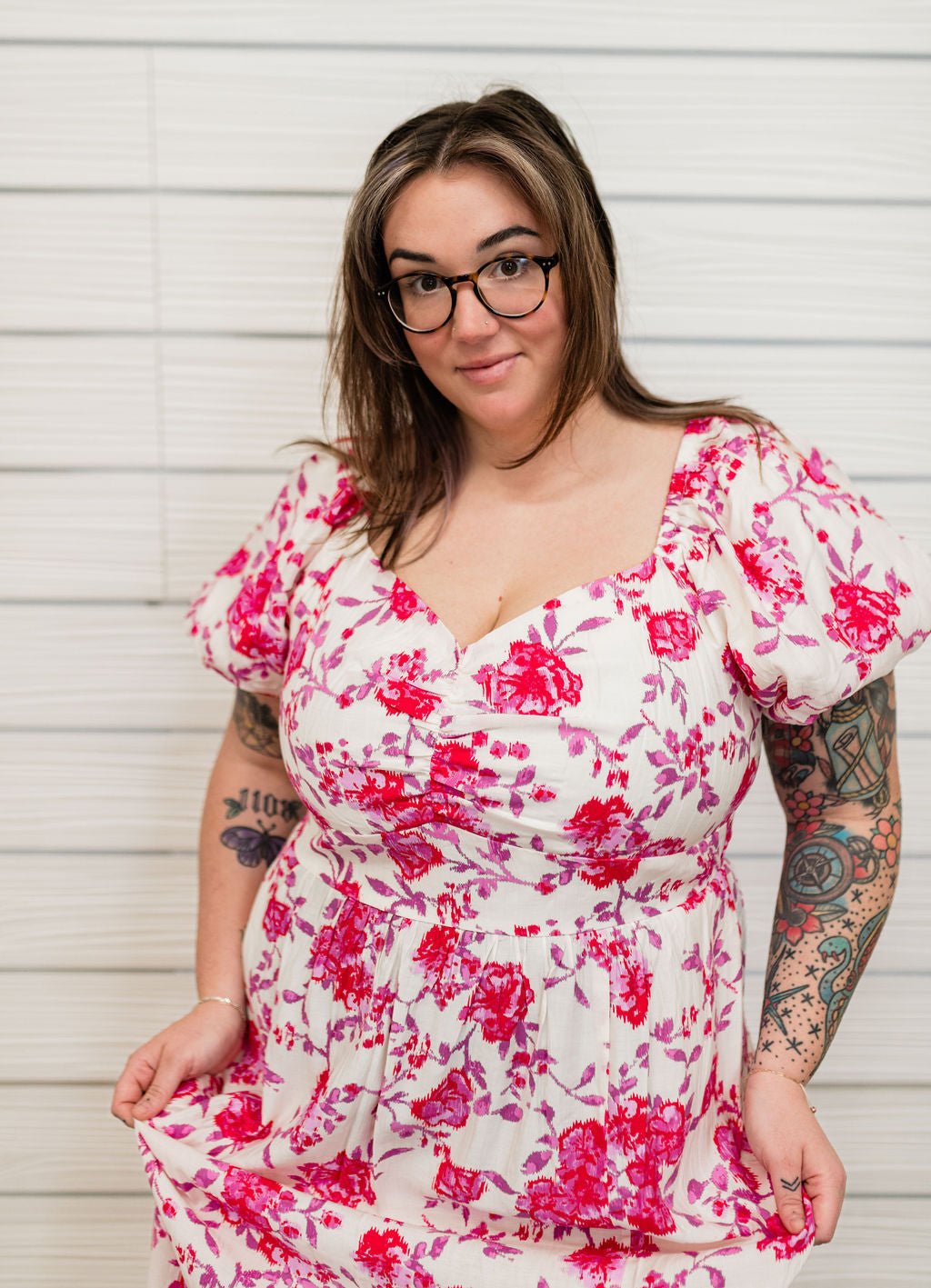 If you aren't in the mood for a dress, but love the pattern of this one, we also offer this gorgeous print in a romper! Check out the Awaiting Love Floral Romper!