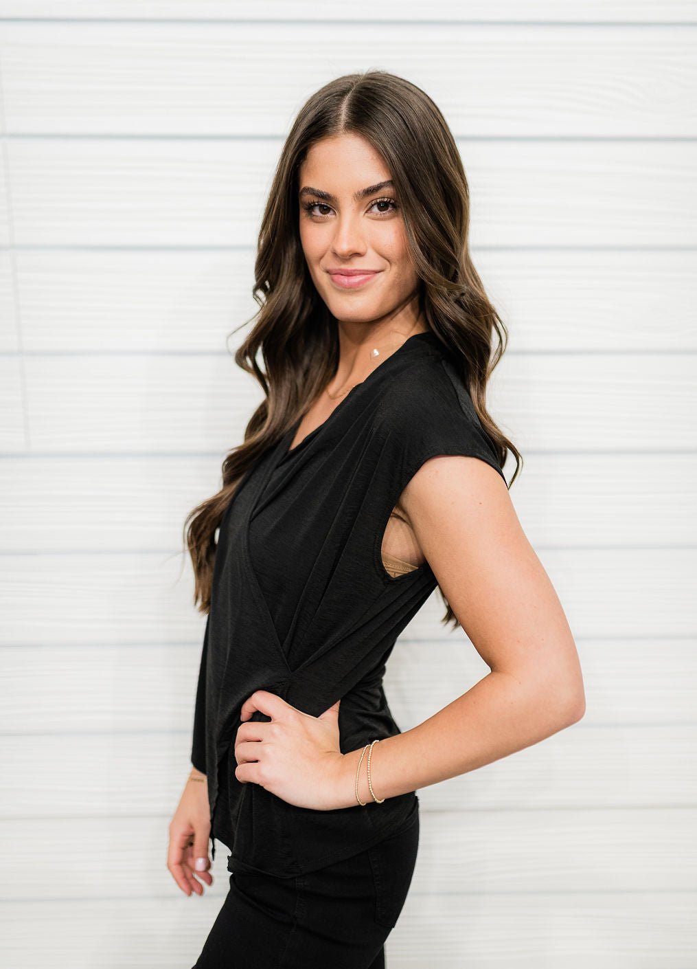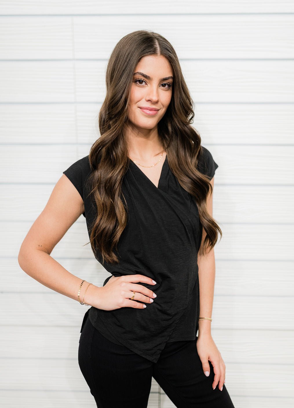 This surplice top is super fun and features a wrinkle-free material. We love the cap sleeve on this top and it that can be worn with a blazer and pants! So stylish and fun! Non sheer, stretchy.