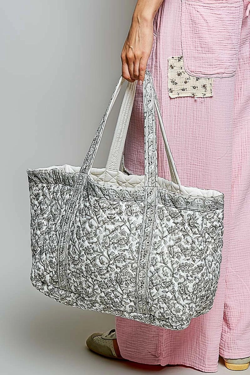 Quilted floral print tote bag featuring a spacious, softly structured silhouette with sturdy shoulder straps. Designed with an allover botanical pattern, contrast border detailing, inner patch pocket, and a lightweight padded construction that offers both style and everyday functionality.