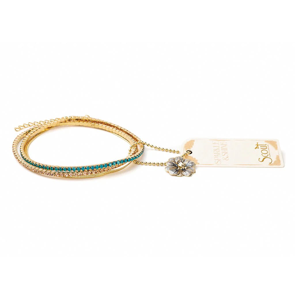 Two graceful rhinestone stretch bracelets are complemented perfectly with a sleek herringbone chain.