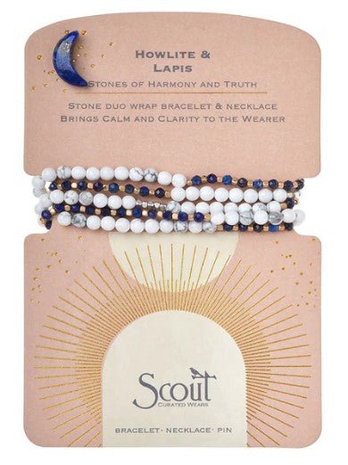 A combination of two gemstones creates a duet of stone power. Wrap as a bracelet or layer as a necklace and pair with the accompanying crescent moon stone pin.