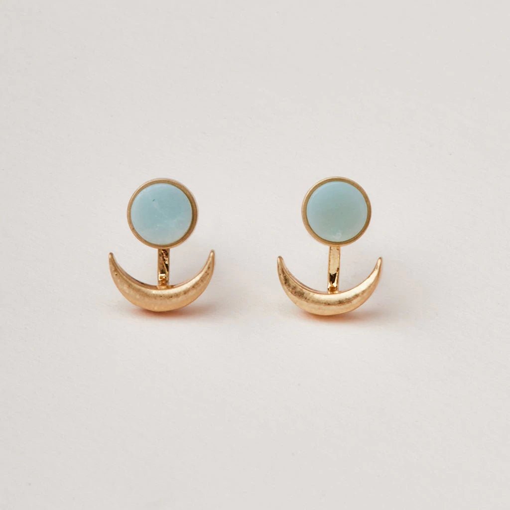 Two pieces come together to create a unique look. The full moon stone compliments a crescent moon piece that attaches to the back and hugs the earlobe. Can be worn three ways: As a stud, stone stud and crescent moon together, or the crescent moon can be attached to any stud earring to create a new look.