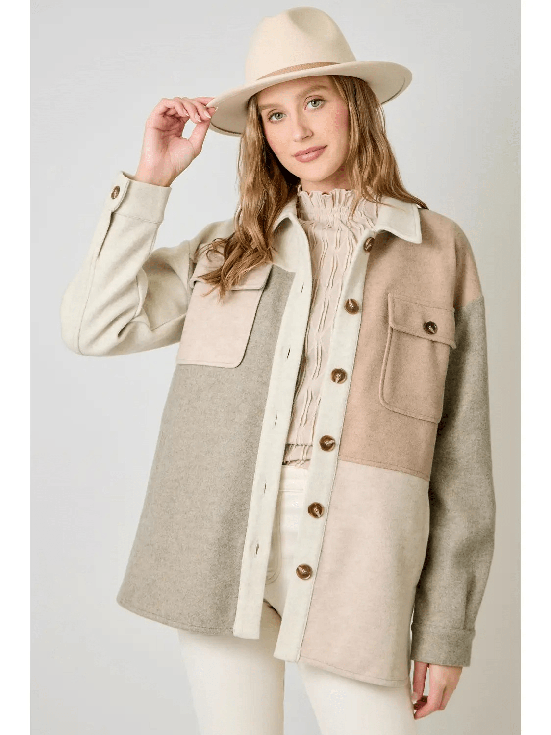 Color Blocked Shacket, Button down, Side pockets, Buttoned chest pockets, Hi-lo hem.