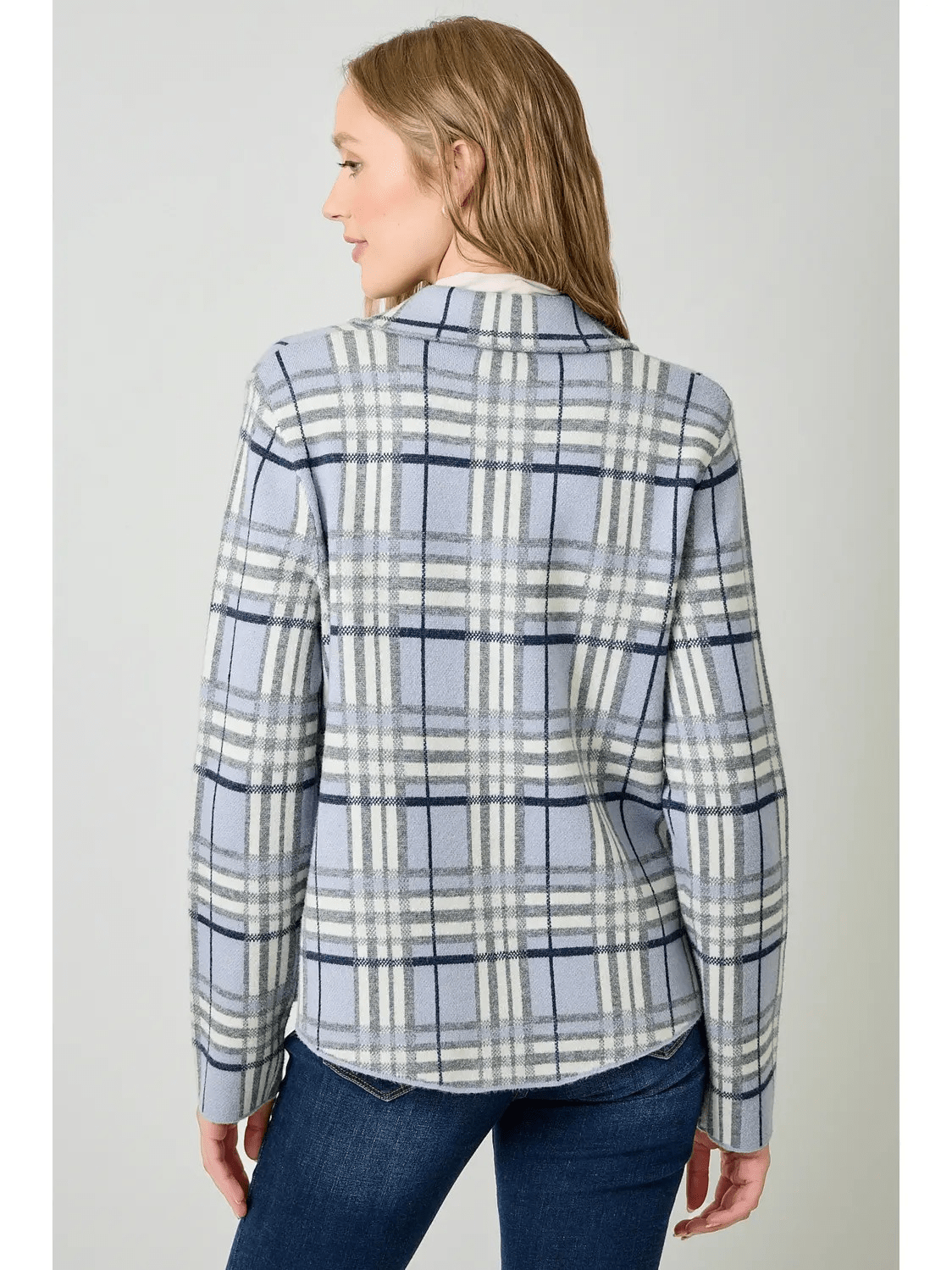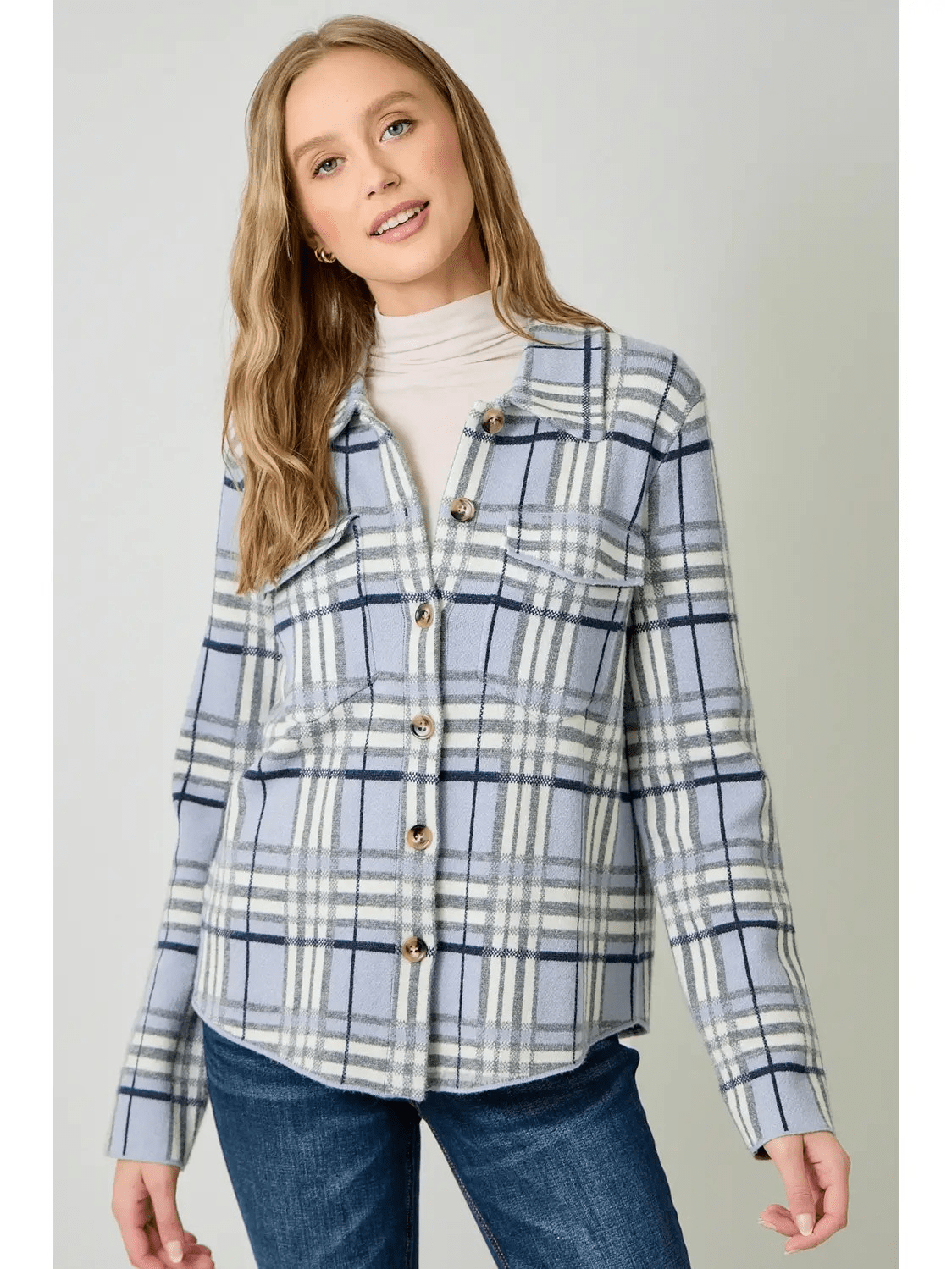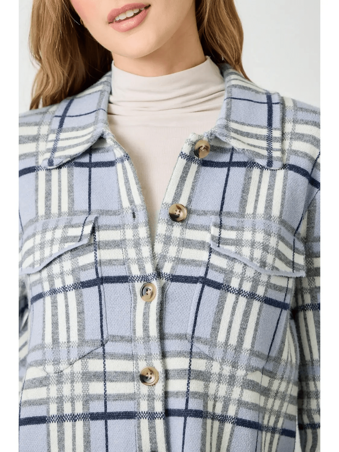 Plaid Patterned Shacket with a sweater feel, Button down, Chest pockets, Hi-lo hem.