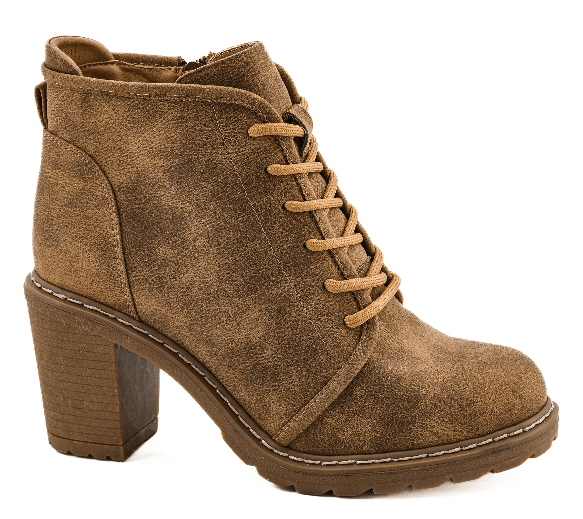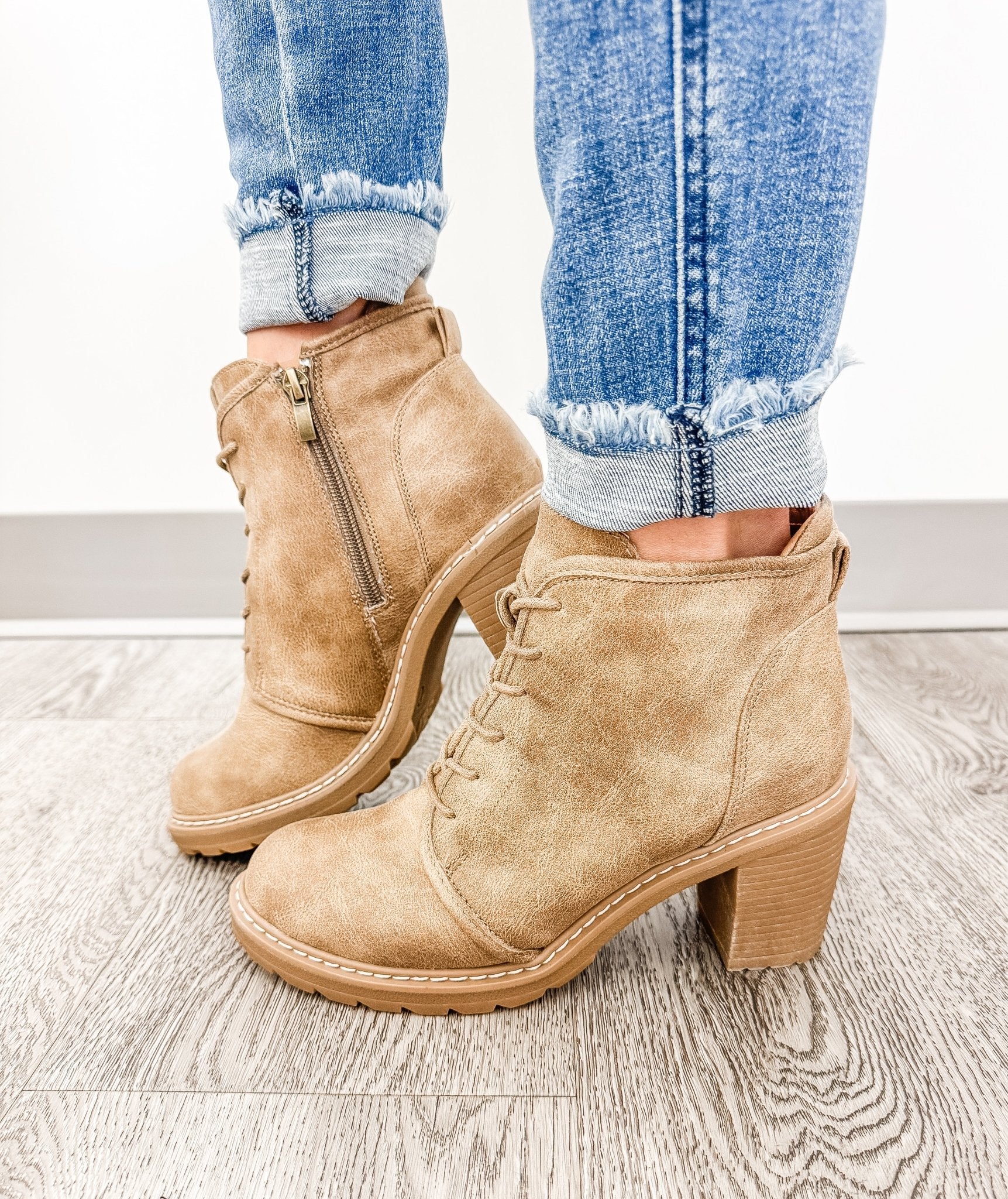 Step into elevated style with the Broomstick Lace Up Bootie from Corkys. These chic tan high-heel booties combine timeless lace-up detail with a modern silhouette—perfect for adding a sophisticated touch to any outfit.