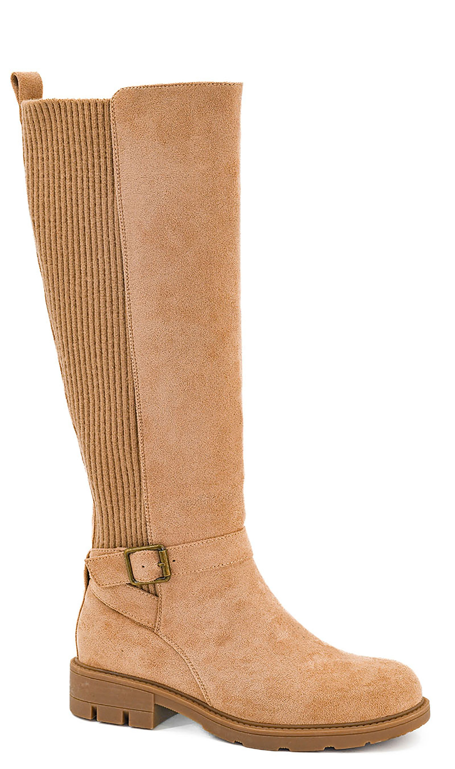 These are your perfect everyday essential boot for fall! These have a faux leather look with that cross over buckle detail. There is a zipper to give you easy access to slip these on. But the best part is the STRETCH these boots have in the calves.