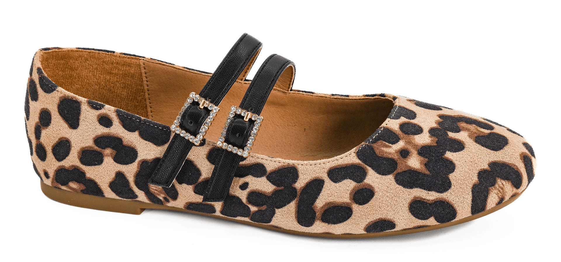 Add a fierce twist to your flats collection with these leopard print flats. Featuring bold black double straps, a classic round toe, and comfy faux suede texture, these shoes bring the perfect balance of playful and polished—great for work, weekends, or a pop of print.