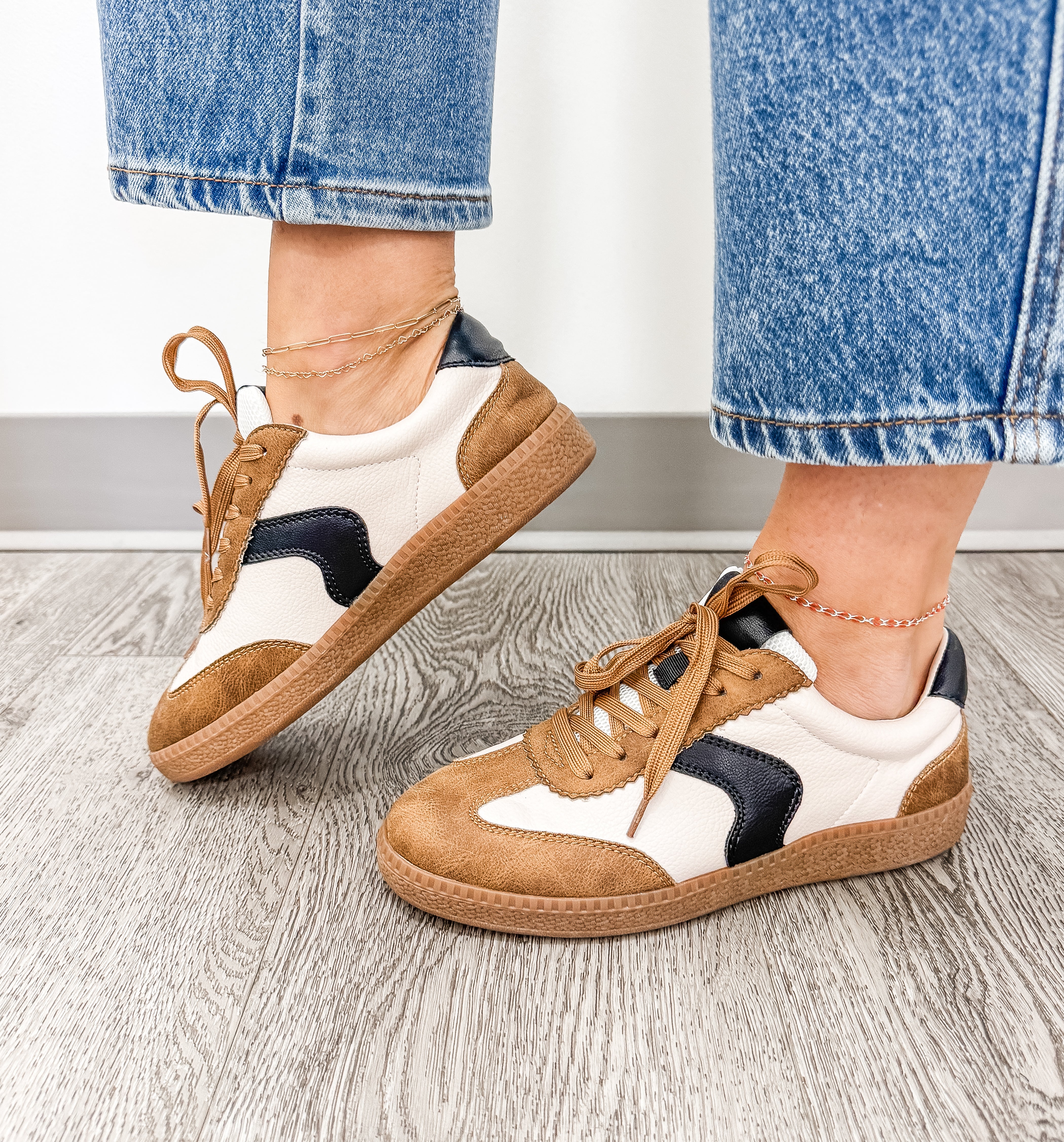 Spoiler Alert: These will be your new favorite sneakers. With soft suede-like texture in a tan combo and retro-inspired vibes, these Corkys kicks are the perfect blend of casual and cool. The cushy insole and gum sole make them comfy enough for all-day wear — errands, brunch, or just showing off.
