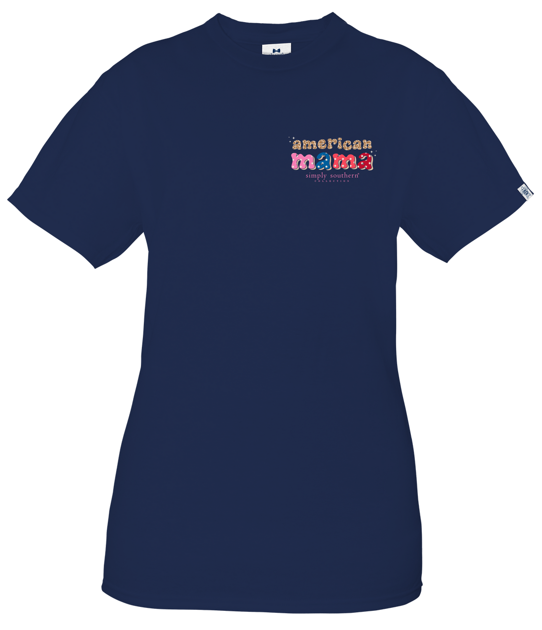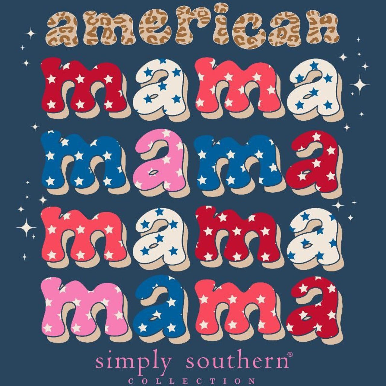 Midnight blue short-sleeve shirt with the word AMERICAN in leopard print and the word MAMA in a patriotic print repeating four times. Simply Southern logo below.