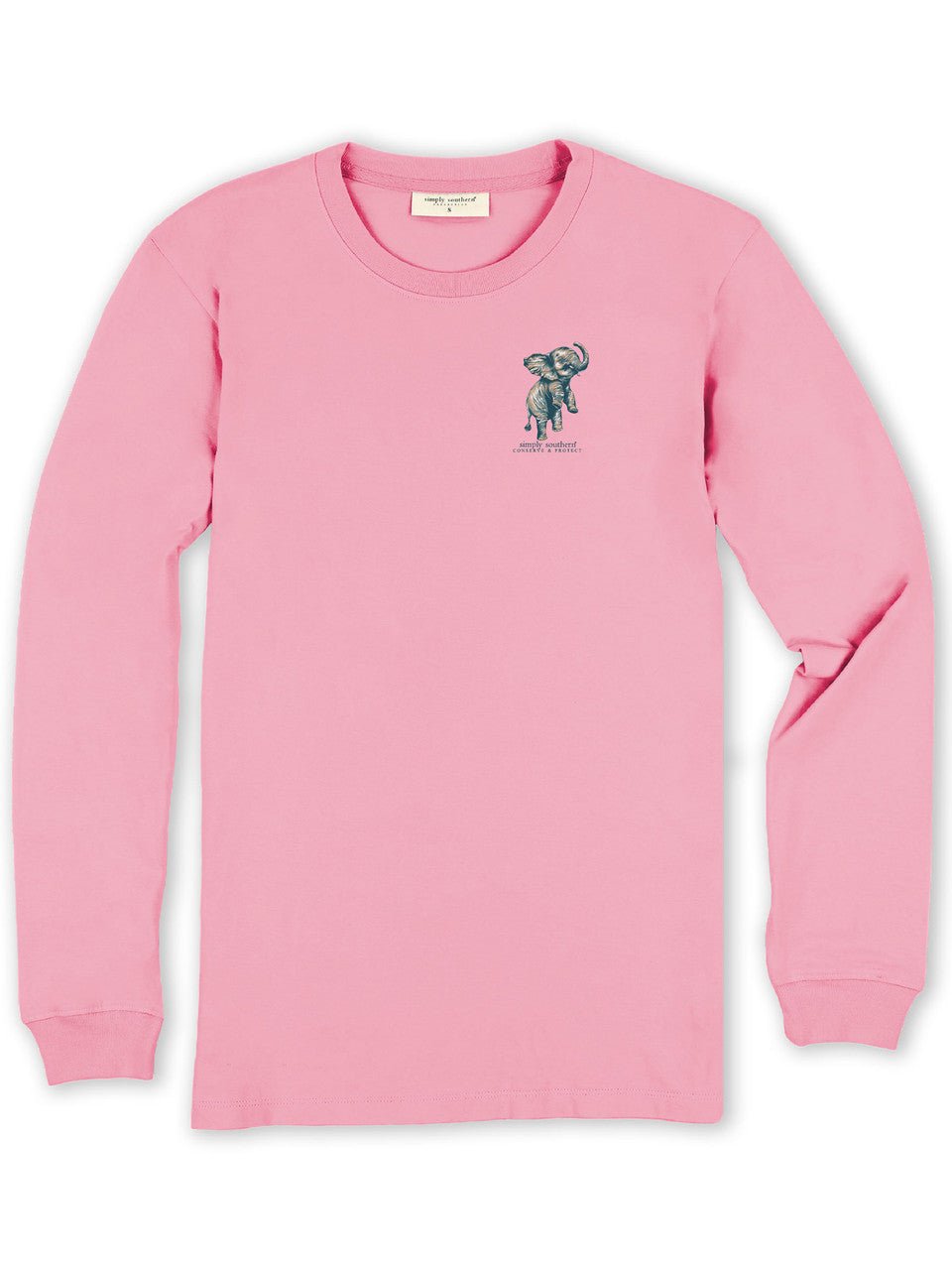 This Simply Southern "Born To Bloom" long sleeve shirt features the phrases 'Born to Bloom' and 'Conserve and Protect' and an elephant surrounded by flowers. Simply Southern logo below, on left chest, and along right sleeve. Unisex sizing. Track shirt.