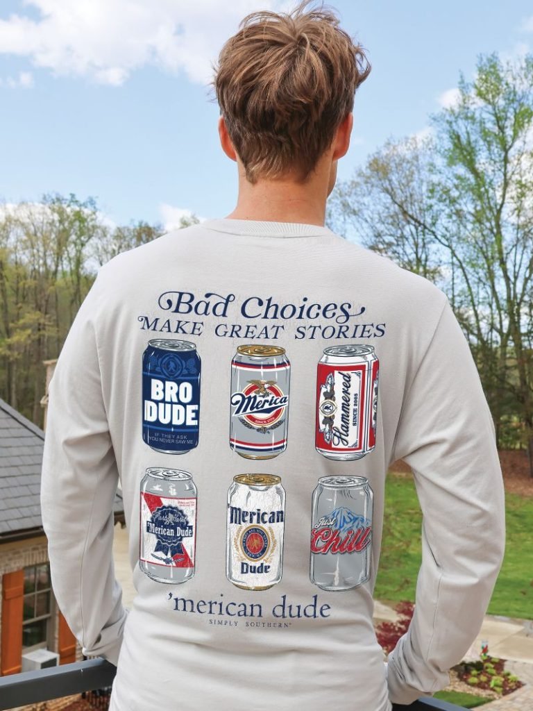 Like grey long sleeve shirt with the phrases 'Bad Choices make great stories' and 'merican dude' with multi designed beer cans on the back. Simply Southern logo below. The same phrase 'merican dude' on the front left chest area. Unisex sizing.