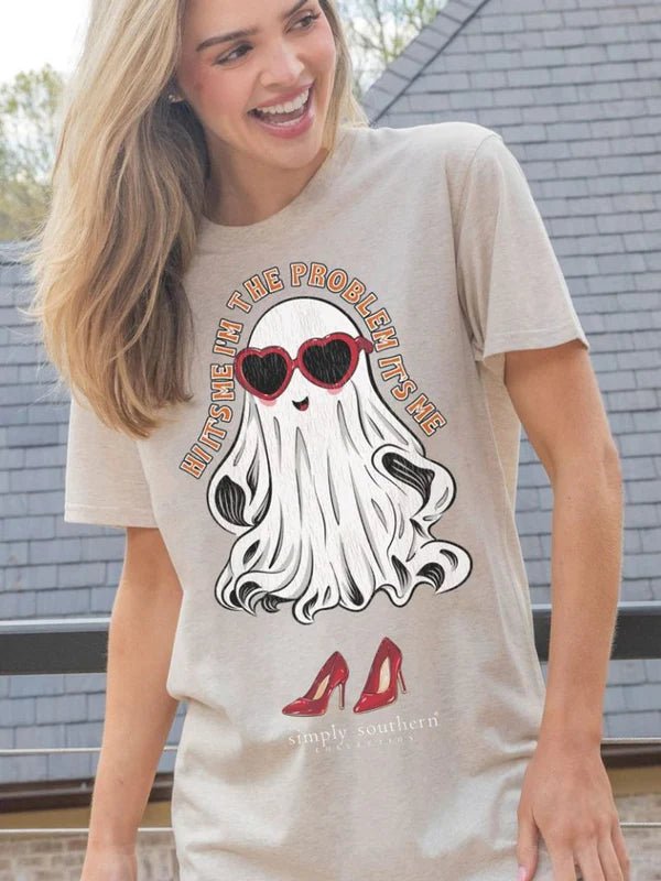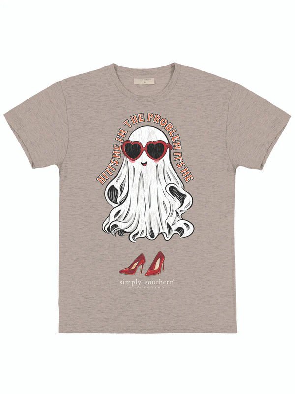 This Youth Simply Southern graphic shirt in short sleeves features the phrase 'Hi it's me, I'm the problem, it's me' flowing around a ghost wearing shades and heels. Simply Southern logo below.