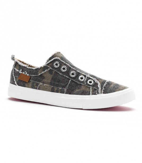 Canvas sneaker with a rubber sole, canvas upper, elastic straps, and decorative eyelets.