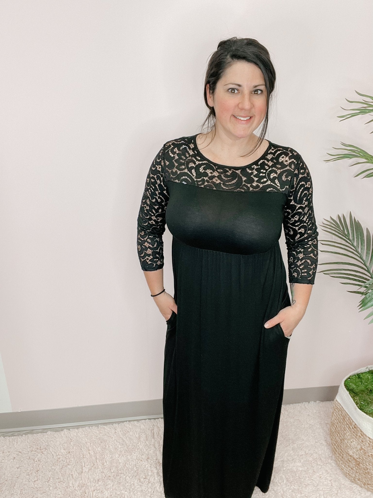 THREE QUARTER SLEEVE ROUND NECK LACE AND SOLID CONTRAST MAXI DRESS WITH SIDE POCKET DETAIL