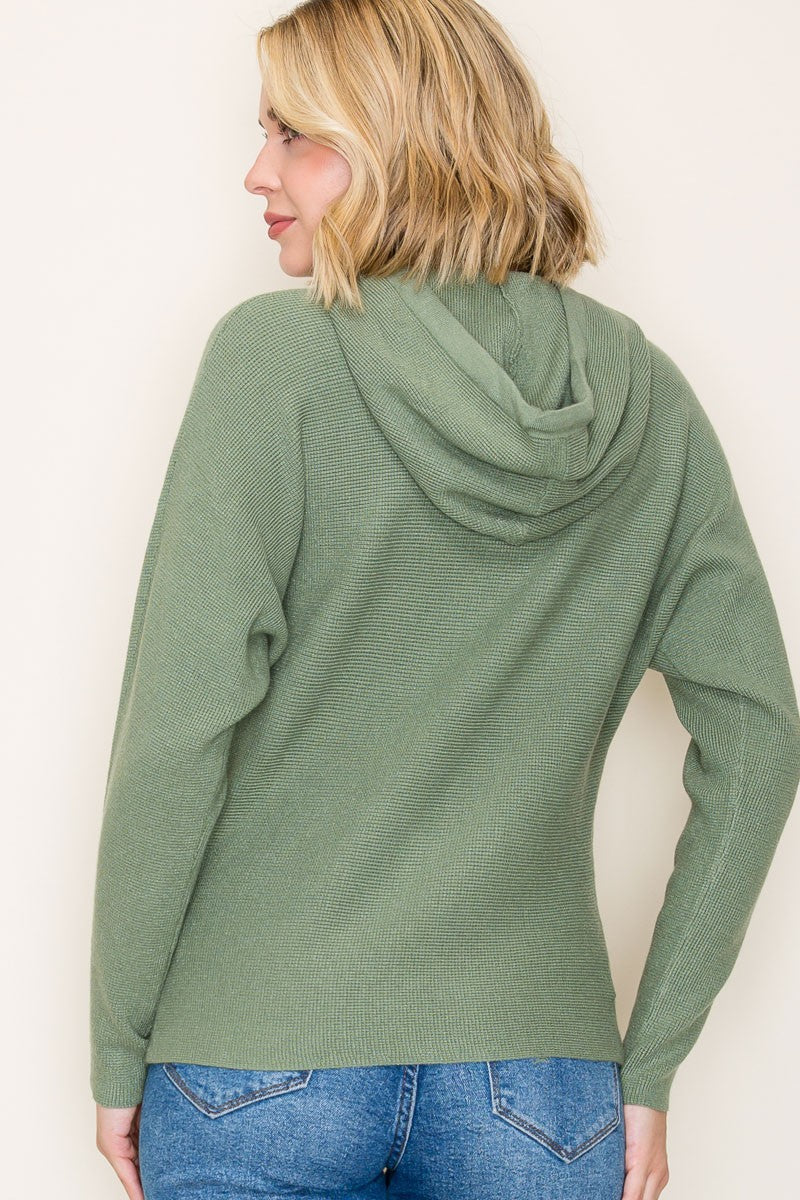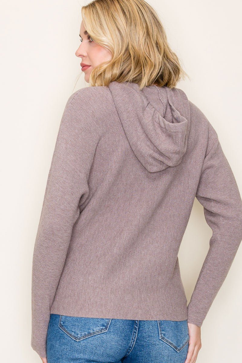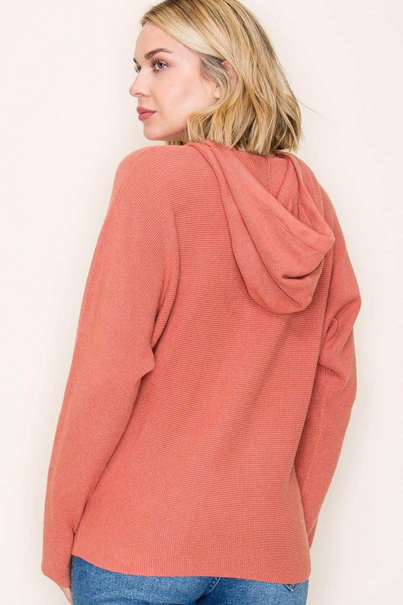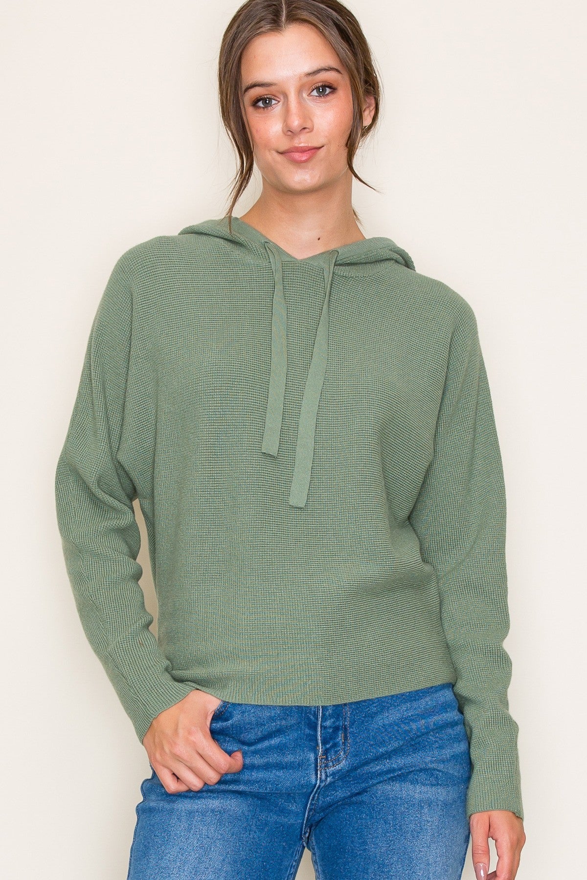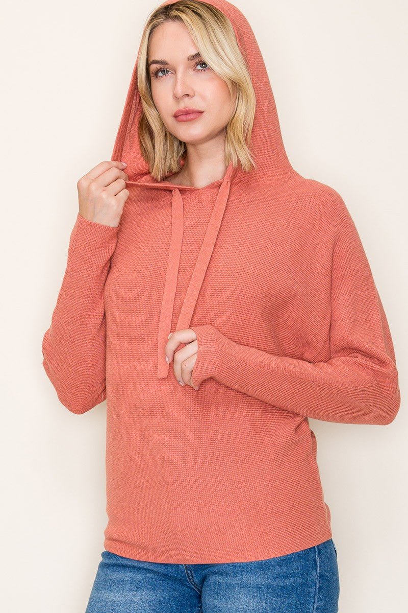 Cozy up in our Cozy On Up Waffle Hooded Pullover Top. The mini waffle texture adds subtle dimension and style, while the dolman sleeves offer a relaxed, comfortable fit. With its classic hoodie design and pullover ease, this sweater is perfect for casual days or lounging at home. The combination of texture and fit makes it a versatile addition to your wardrobe, blending comfort with modern flair.