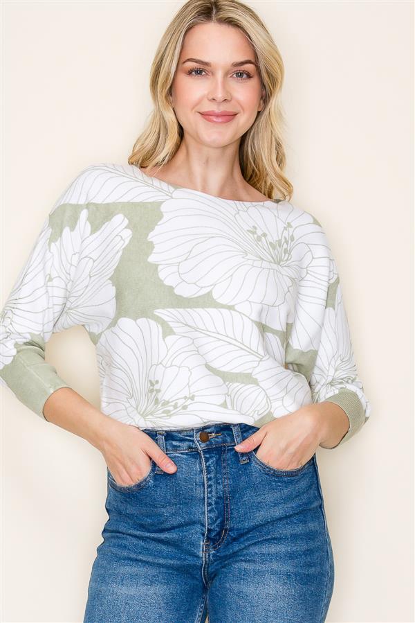 BOAT NECK, 3Q DOLMAN SLEEVE, FLORAL PRINTED, PULLOVER SWEATER