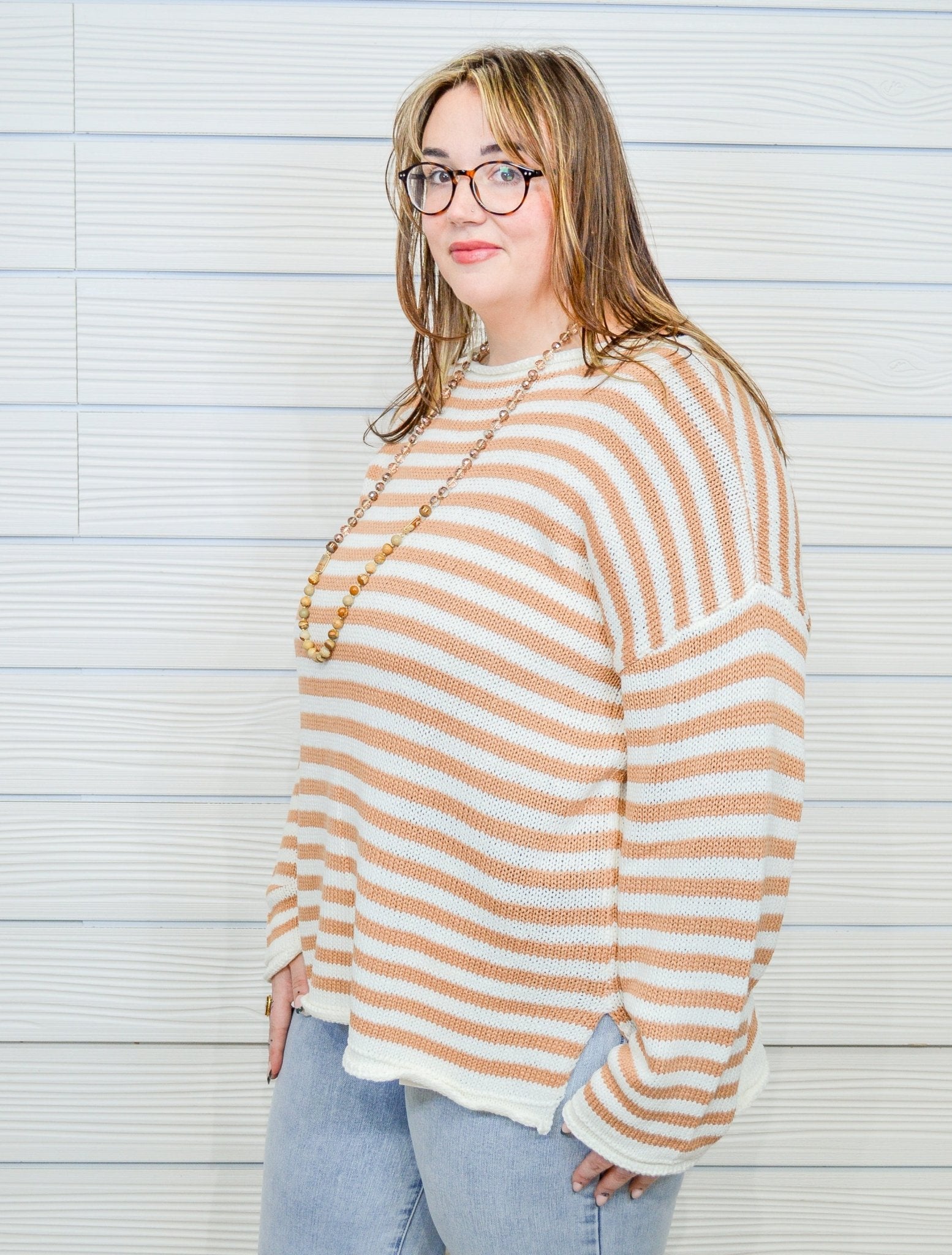 Revamp your wardrobe with the Second Chance Stripe Sweater. This versatile piece features a playful white and camel stripe design, perfect for adding a texture of color to any outfit. Whether you're running errands or hitting the town, this sweater provides a stylish and comfortable second chance to your daily looks.