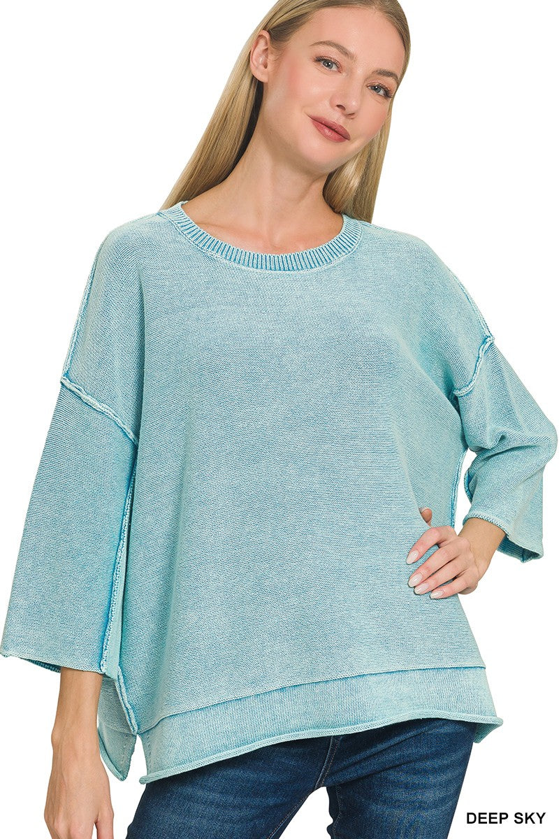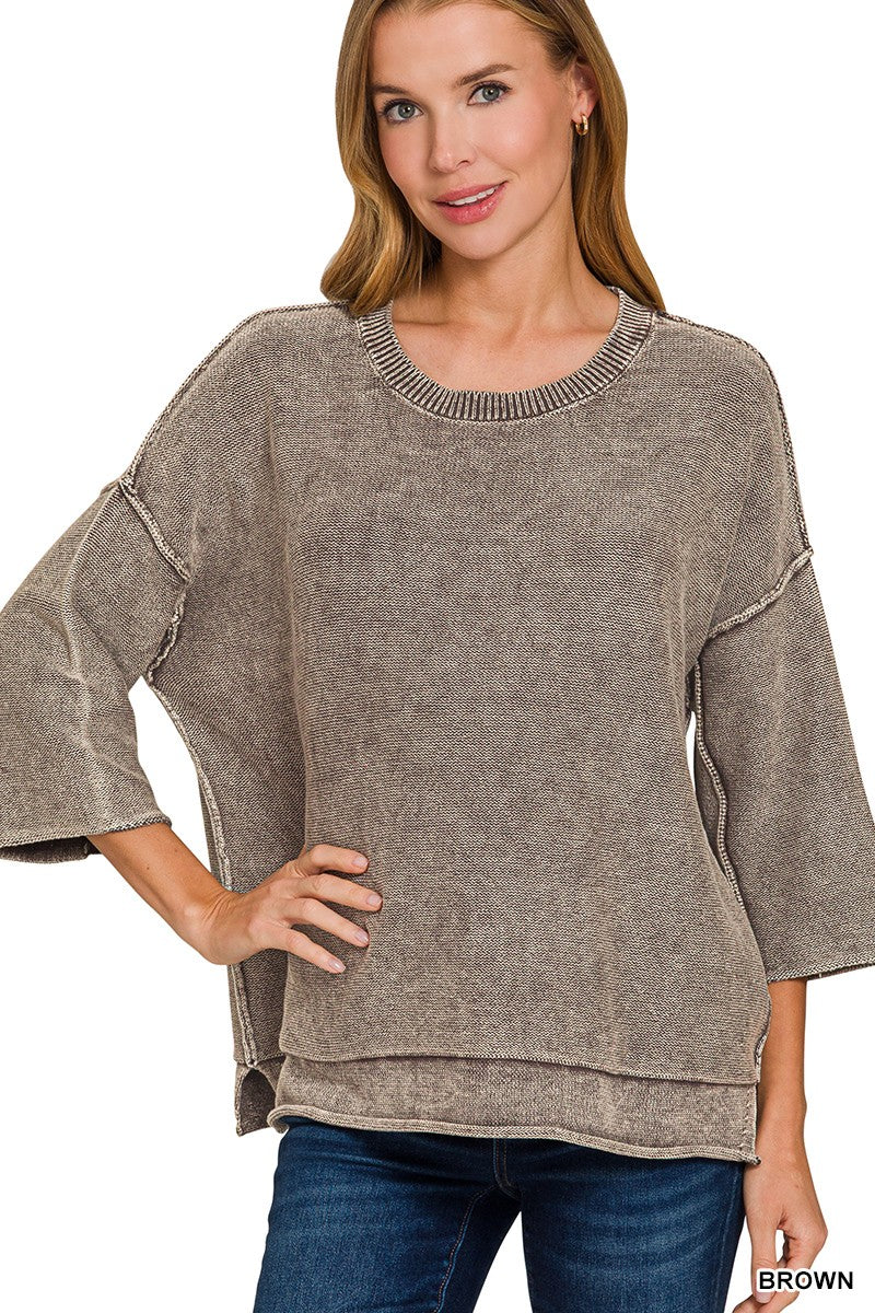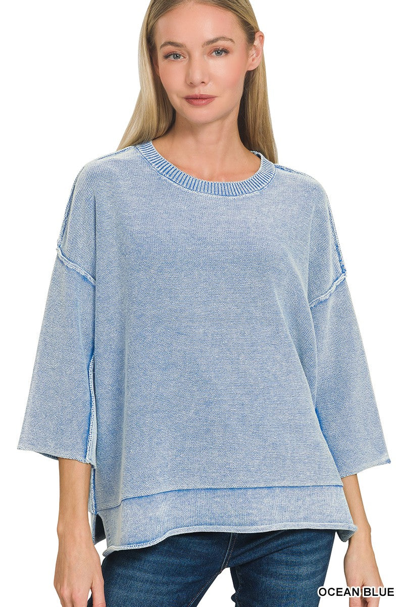 WASHED 3/4 SLEEVE BOXY SWEATER -SIDE SLITS