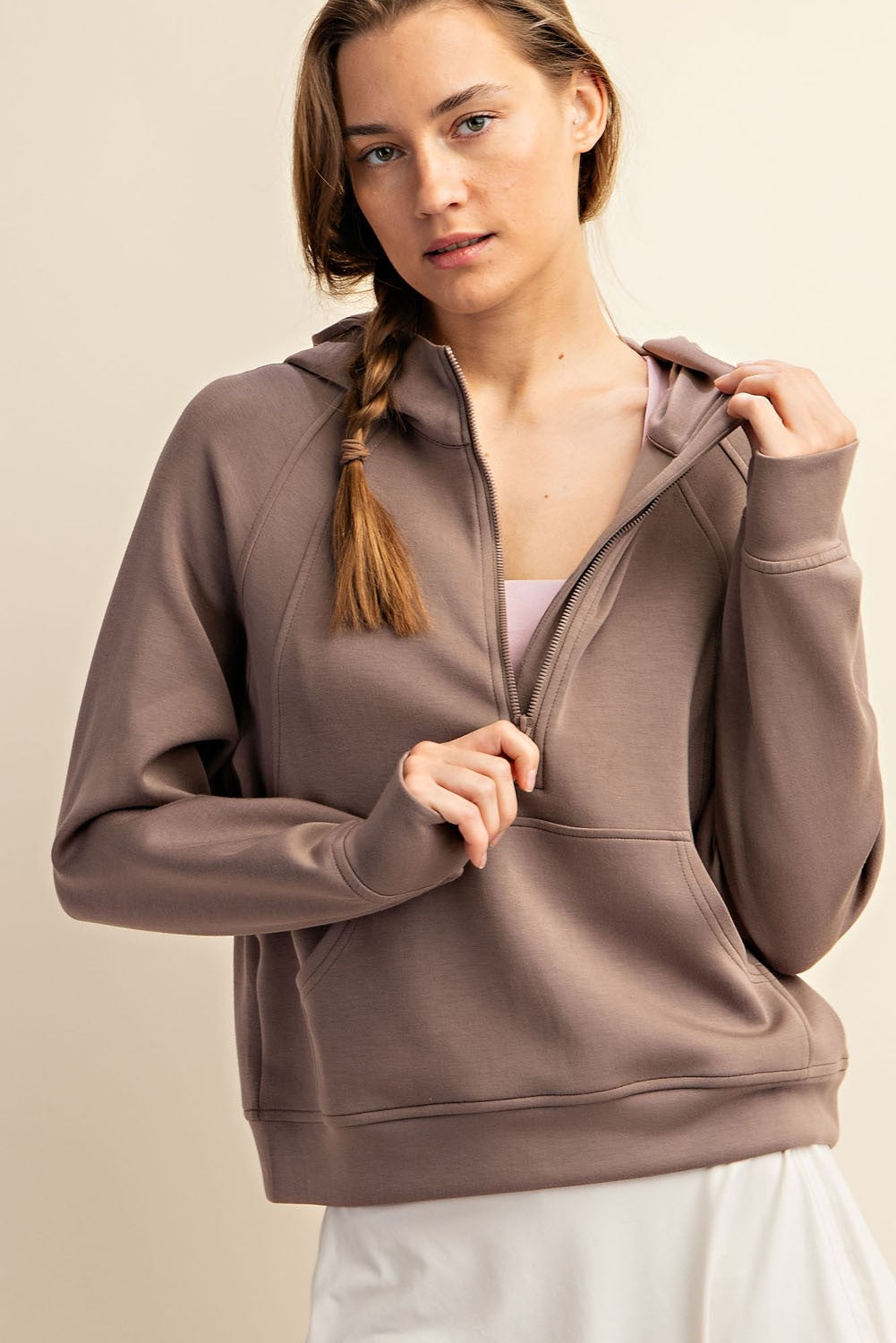 Features: - Modal Poly Span Scuba Fabric - Silky smooth and Lightweight - Slightly cropped - Relaxed fit / Oversized - Hoodie - Quarter zipper closure - Kangaroo pocket - Thumbhole detail