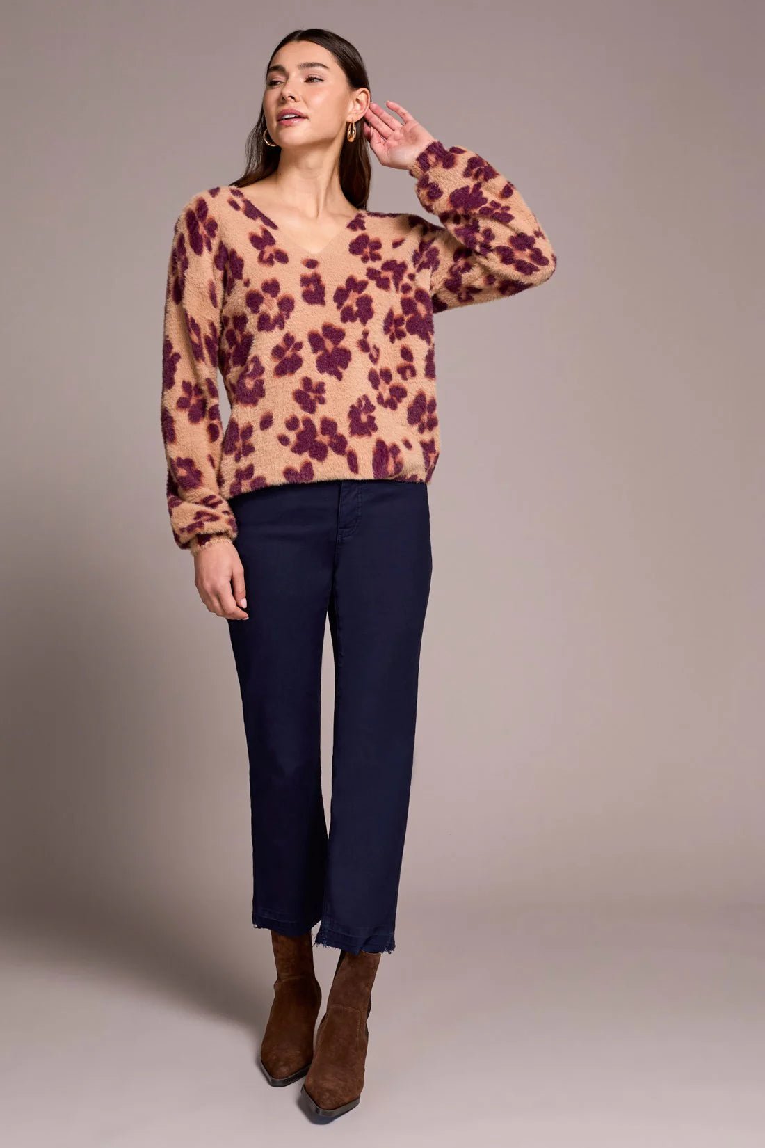 Infuse your everyday style with chic charm and delightful comfort with this floral print sweater. Crafted from soft eyelash yarn, it features a flattering pop-over v-neck design and long bishop sleeves, imparting an airy feel and fashionable flair to your ensemble.